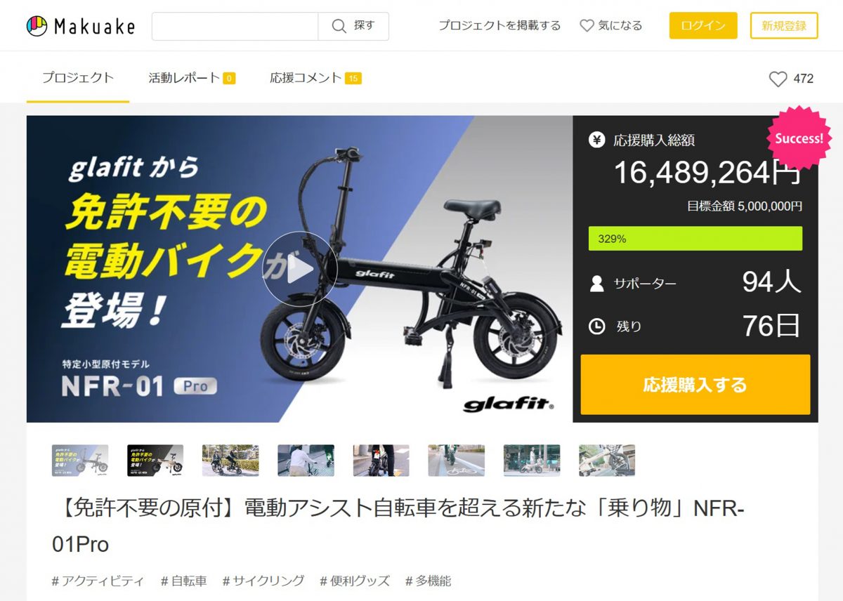 3月14日、glafitは特定小型原付「NFR-01 Pro」の先行予約販売をMakuakeにて開始した。道交法改正によりできた新車両区分「特定原付」の新しい乗り物で、座って乗れる免許不要の電動バイクとして注目を集める同製品は、プロジェクト開始から2時間でなんと1000万円を突破!