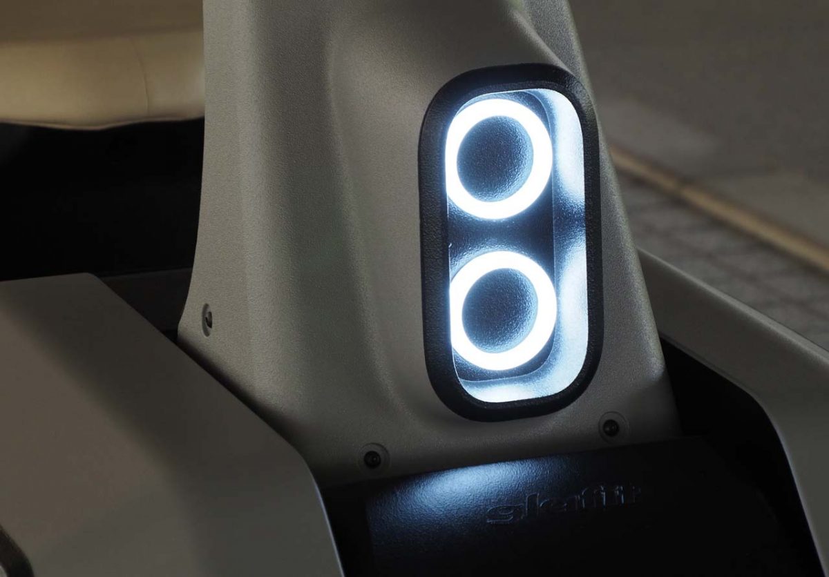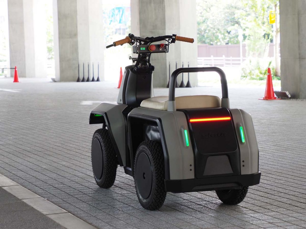 車体を目の前にして実感するのは、高齢者が乗る「シニアカー」よりもずっと大きいところ。それでも特定小型原付の長さ190cm以下、幅60cm以下の枠内に収められているそうで、逆にこのサイズがあるからこそ道路上でも目立つ存在となり、後続車からの視認という意味でもメリットがありそうと感じました。