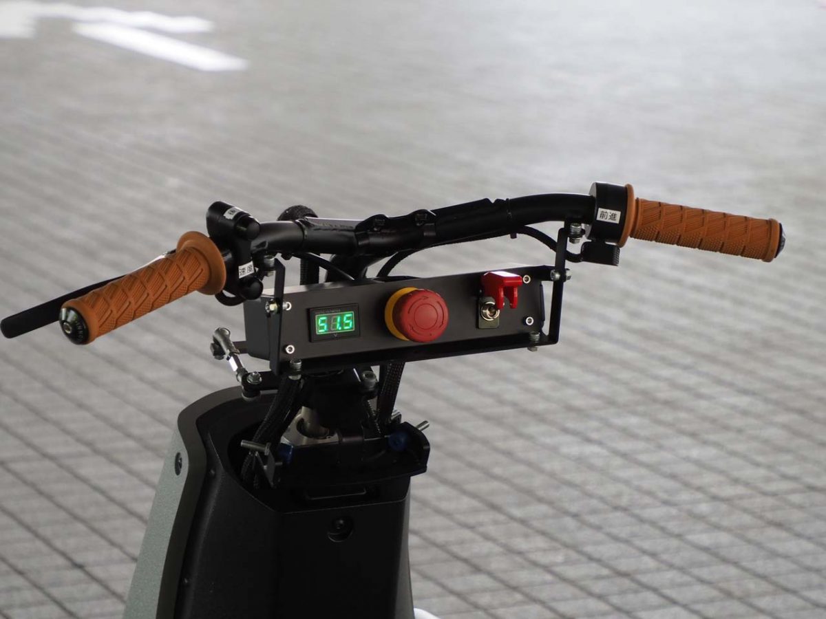 試乗してみると、プロトタイプの操作はとても簡単でした。電源をONにして、ハンドルの右側グリップ下にあるレバーを押し込むだけで車体はスルスルッと動き出し、レバーを放したら回生ブレーキで減速します。もちろん、ブレーキ機構は後輪を制動する仕組みとして別途備えられていますが、回生ブレーキがかなり強力なので、この日の試乗で使うことはほとんどありませんでした。