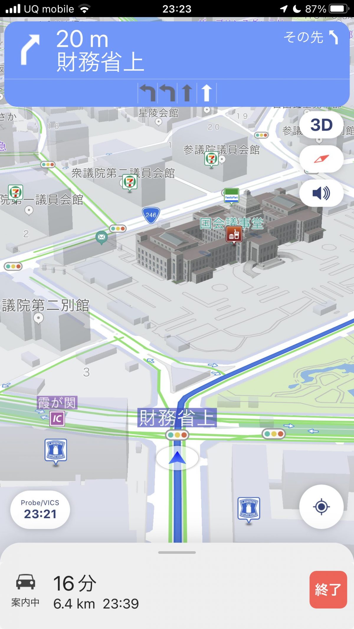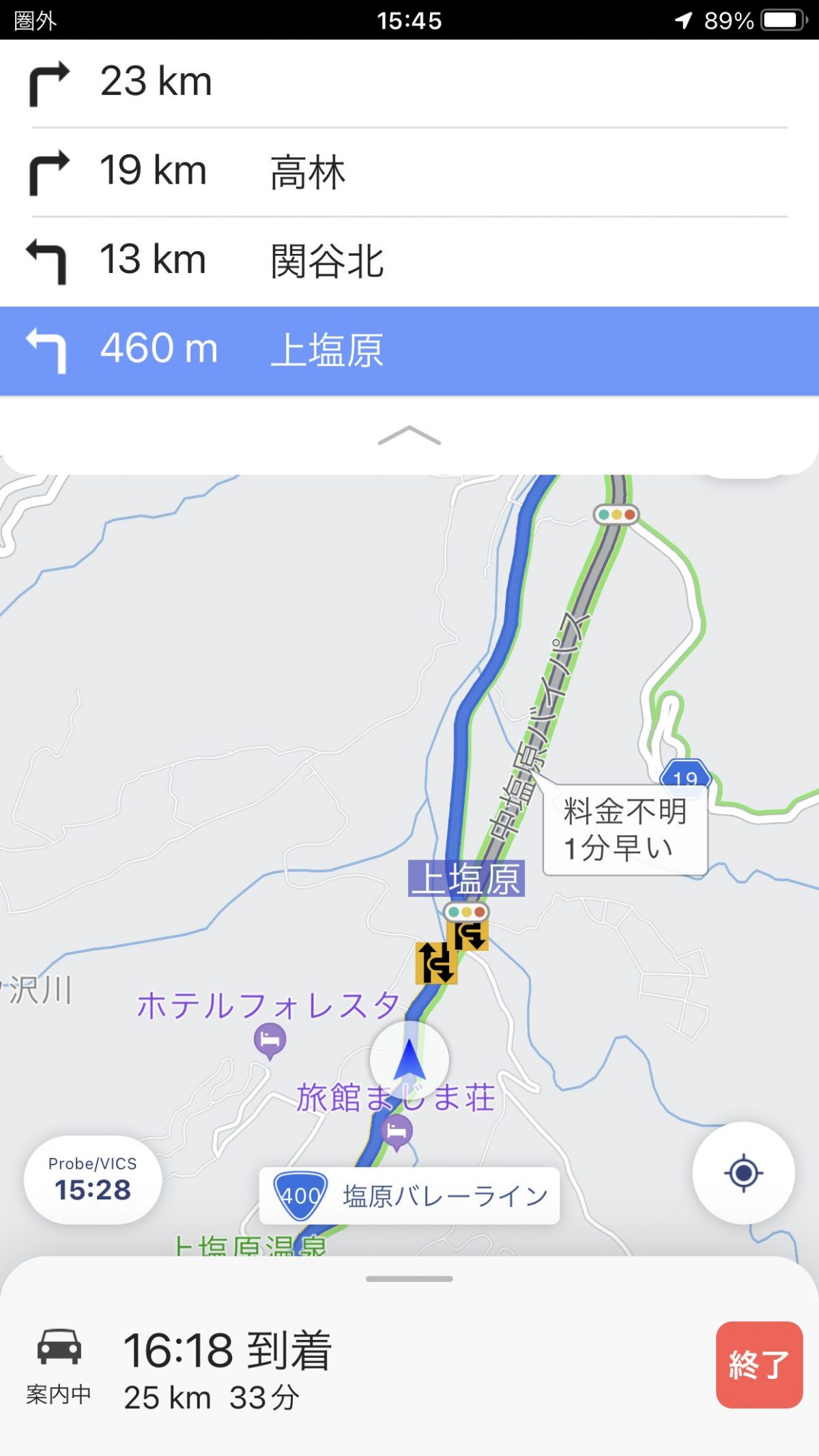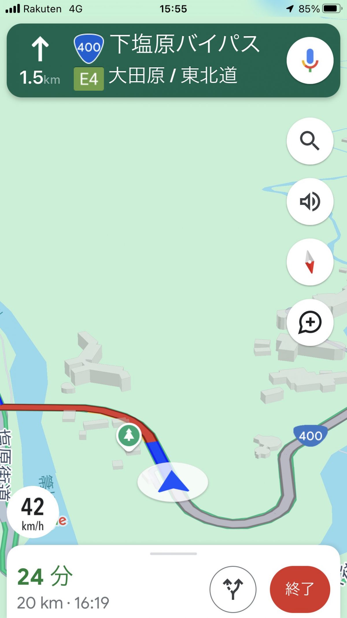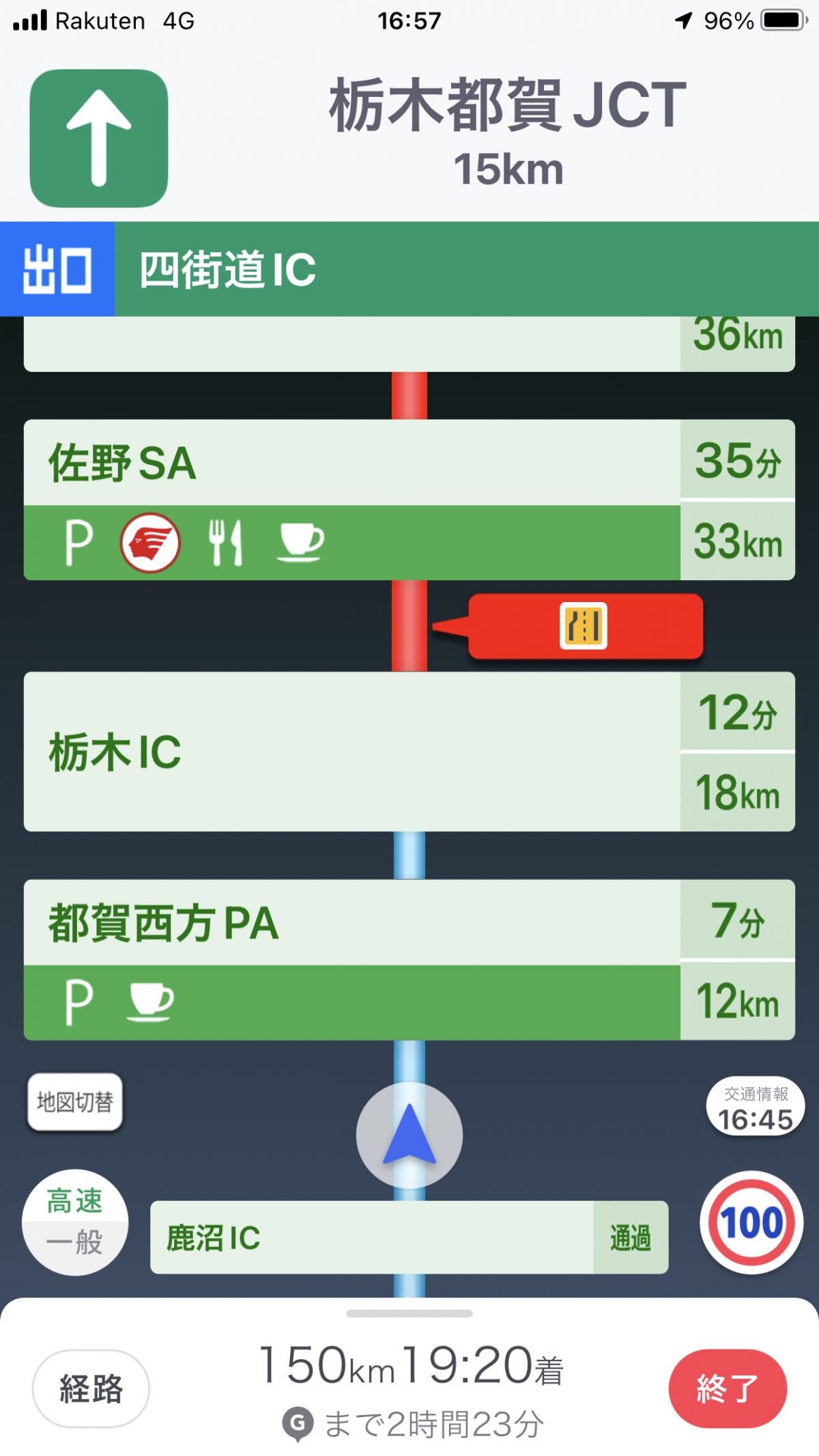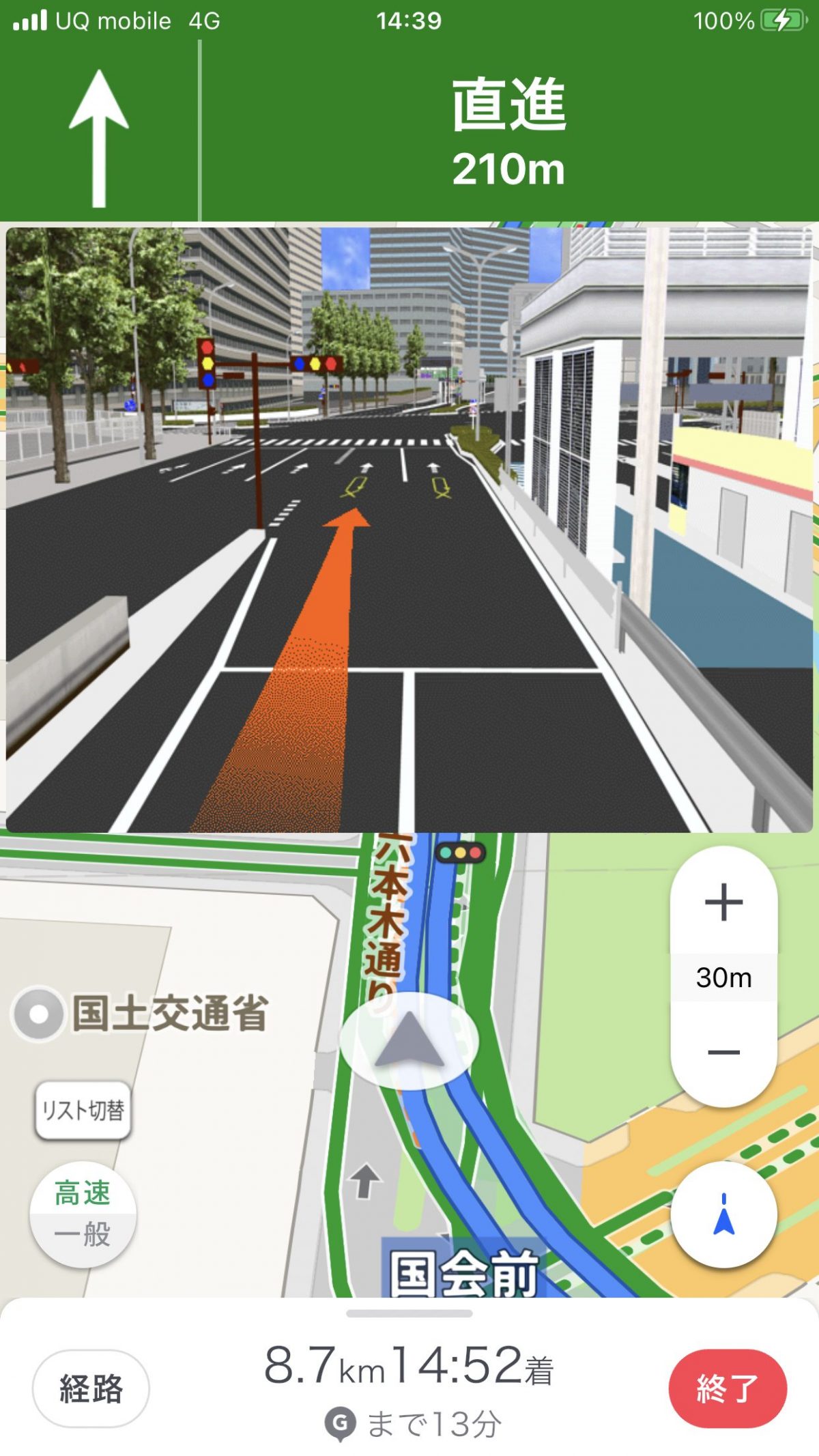 ルート案内中は、車載ナビのような交差点拡大図こそ用意していませんが、分岐点に近づけばルート上に進行方向を示す矢印を重ねて表示。交差点名は音声でも読み上げますし、車線ガイドも表示するので、よほど複雑な交差点でもなければ道に迷うことはないと思います。また、並行する道路の切り替え機能も備えられ、地図上ではリアルタイムの速度も表示されるようになりました。