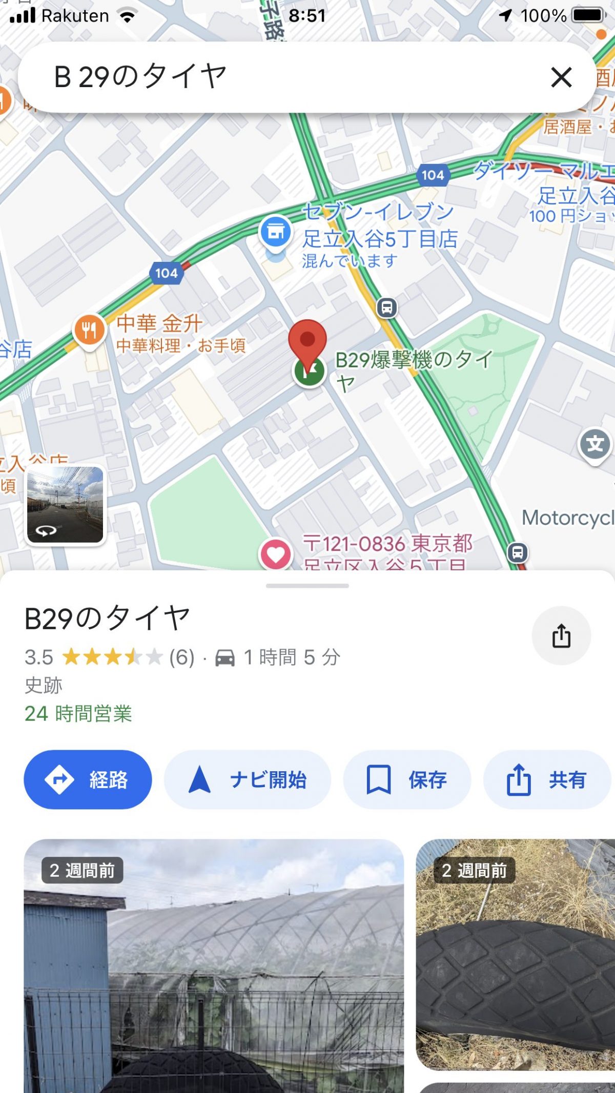 そして、Google マップの実力の高さを見せつけられるのが、優れた目的地の検索能力です。うろ覚えの施設名を入力しただけで、施設名を推測して候補をリストアップし、しかも思いついたキーワードに対しても驚くほど正確に結果を出してくれるのです。もちろん、音声での入力にも対応。先日も、戦時中に米軍の爆撃機「B29」が墜落し、そのタイヤが残っている場所を検索するため、「B29のタイヤ」と入力すると、それだけでその場所を地図上に表示してくれたのです。こんな雑な検索で結果を出すのは他のアプリではあり得ないことです。