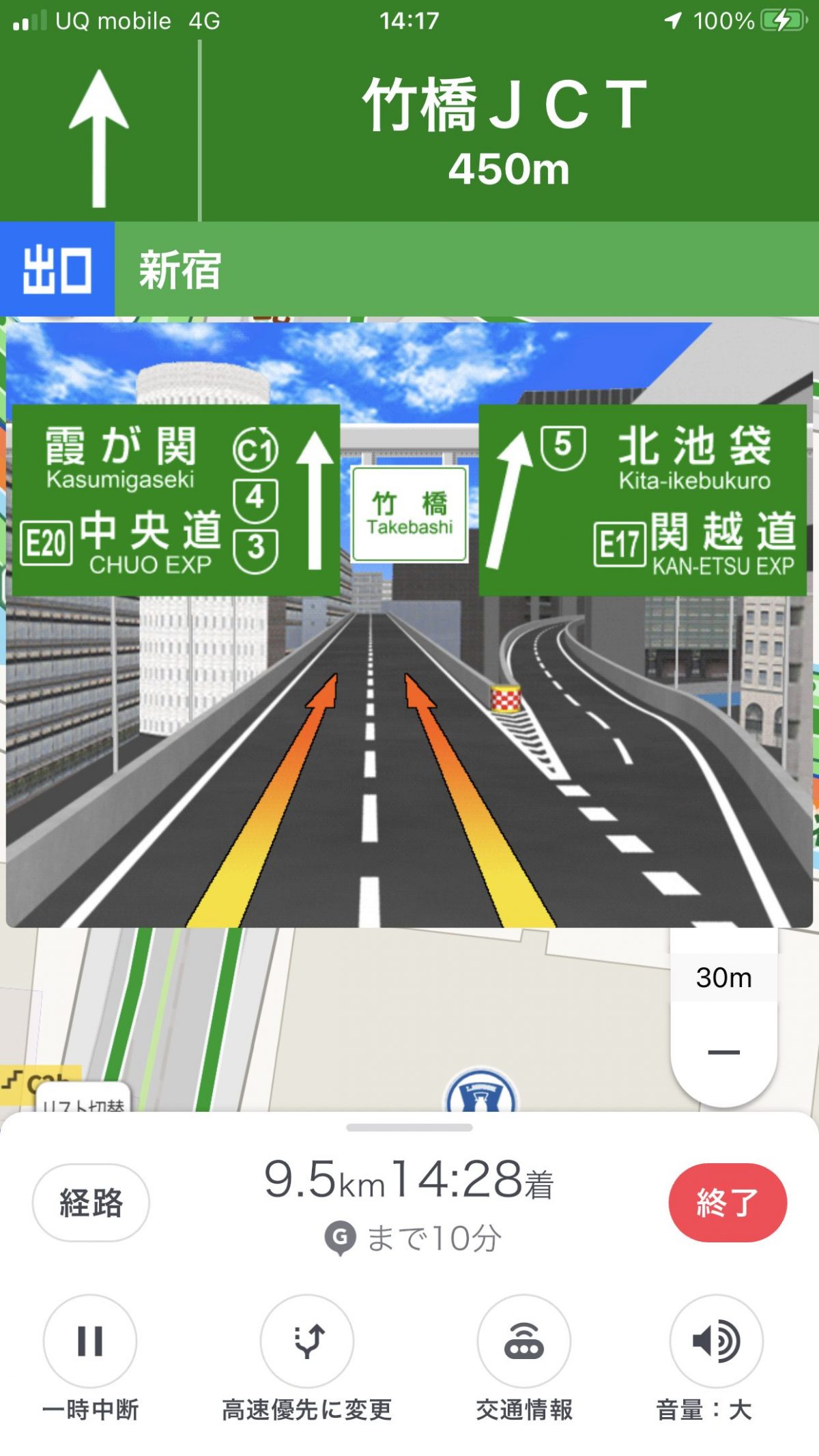 トヨタ発のアプリだけに、その使い心地はトヨタの純正カーナビのクオリティを実感します。交差点名を読み上げる音声ガイドは「まんま同じ」で、一般道での側道案内や高速道路での合流案内も行うなど、その案内機能はかなり充実。中でも都市高速入口や高速道路での分岐点ではイラストを使って詳細にガイドするなど、進行方向がひと目で把握しやすくなっています。また、何よりも音声がとても聞きやすいため、状況把握がしやすいのも特徴です。