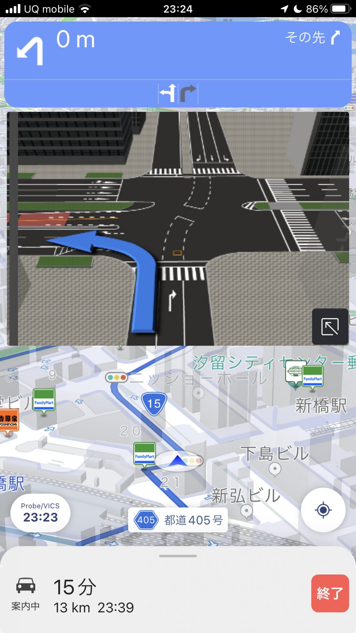 ただ、データが重くなることを避けるためか、交差点拡大図をすべての交差点で表示することはありません。それでもオートズーム機能を使い、分岐点に近づくに従い、地図を自動的にズームアップして、周辺をわかりやすくガイド。信号機の存在も地図上で案内し、交差点名も一部で読み上げられていました。