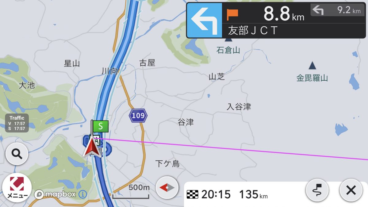 そして、今回驚いたのが、GPS信号を受信できないトンネル内の分岐で、しっかりと追従してみせたことです。このとき、他のアプリも検証しましたが、いずれも分岐には対応できず。トンネルに入ってフリーズしたものもあれば、動いたとしても入口での車速をそのまま反映しただけのものとなっていました。こんなところにもGoogleマップの最先端ぶりを見た気がします。
