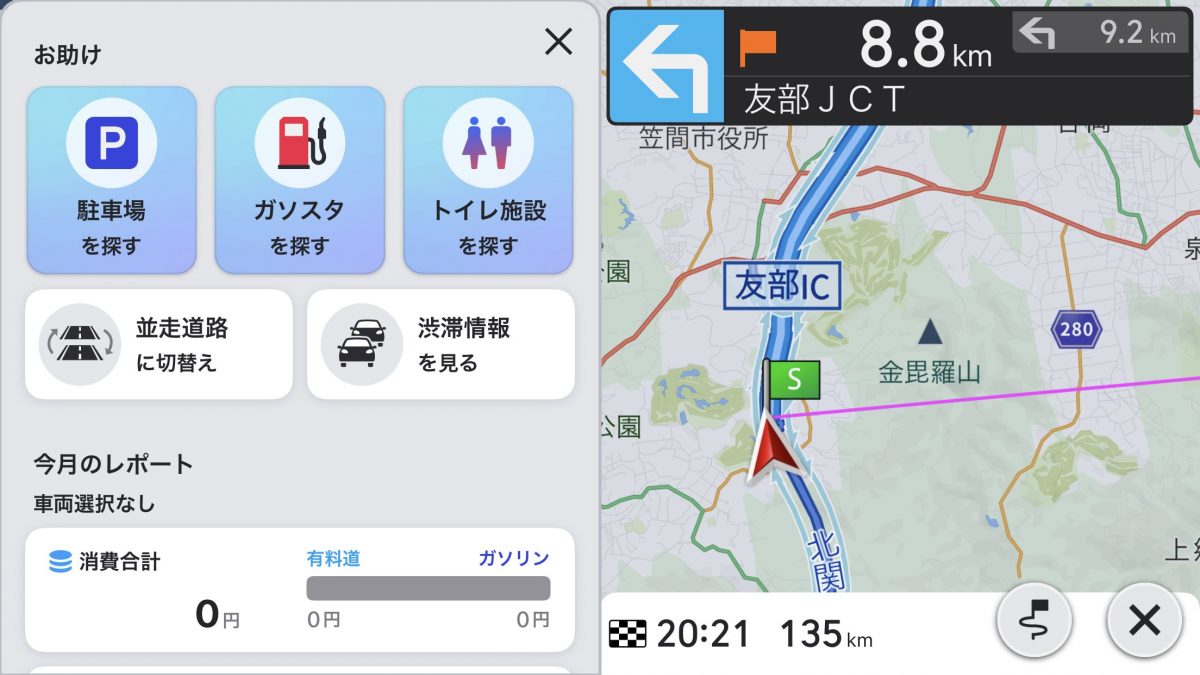 そして、何よりも使いやすさを感じるのが「お助け」メニューです。このボタンを押すと、周辺にある駐車場やトイレ施設をワンタッチで検索でき、ほかにも渋滞情報の確認や並走道路への切り替えなどのアシスト機能が利用できるのです。アプリに使い慣れない人でも簡単に行きたい場所が探し出せるのがメリットです。