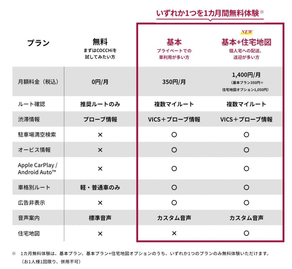 COCCHiは冒頭でも述べたように有料版と無料版があります。有料版は最初の1か月を無料としているので、まずは有料版で登録し、1か月間じっくりと使ってみるのがオススメ。その段階で無料版との違いを判断してみてもいいと思います。ただし、ディスプレイオーディオでの利用を前提とするなら有料版のみの対応ですのでご注意ください。