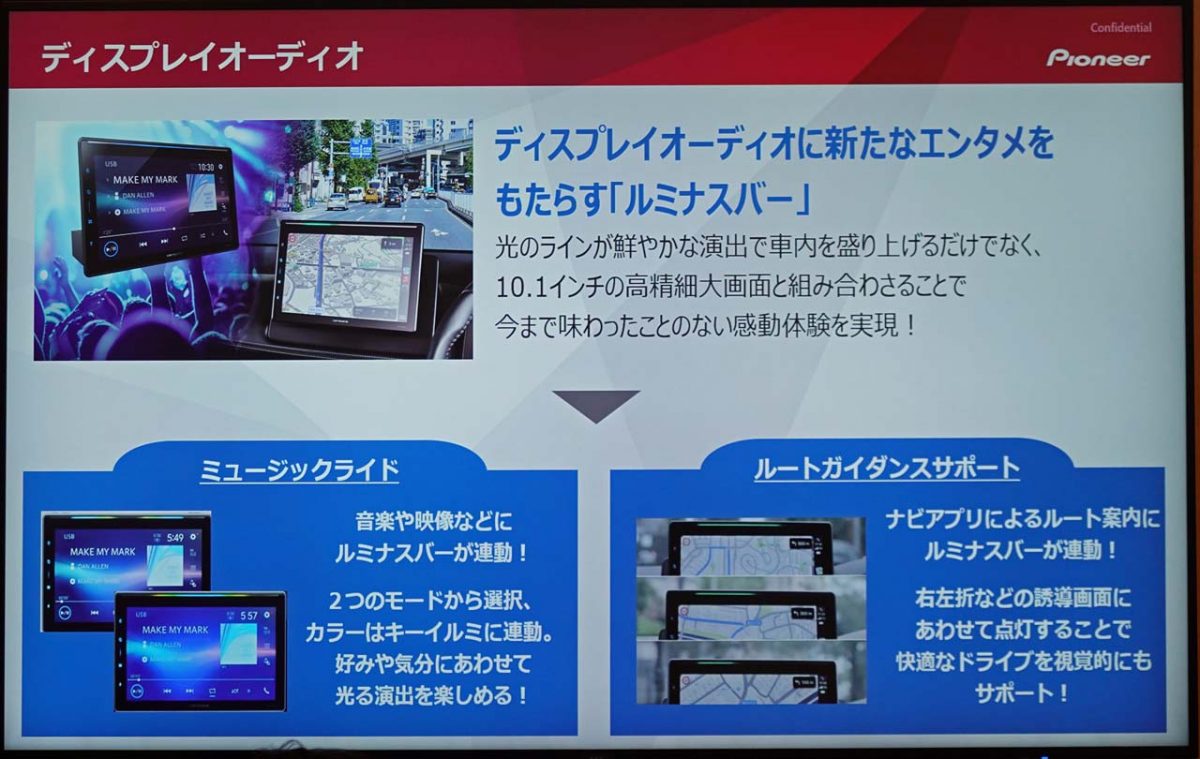 これは、ディスプレイ部の上側に設置された横長のイルミネーションで、音楽のレベルに応じてフラッシングしたり、ナビアプリのルート案内に連動して点灯するというものになります。再生中の楽曲に合わせて光で演出するのが「ミュージックライド」で、発光色や発光パターンは複数用意し、どこか昭和のカーオーディオの雰囲気を醸し出します。また、「ルートガイダンスサポート」は、連携したナビアプリの右左折案内に合わせて、その方向を発光するもので、直感的に曲がる方向がわかることができるメリットがあります。