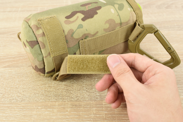 同商品は、“マルチカモ”と呼ばれるシックなカモフラージュ柄のペットボトルホルダー。大きなタクティカルカラビナとベルトループがついていて、リュックの太いベルトにも簡単に引っ掛けられます。