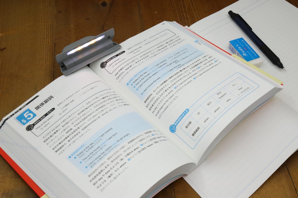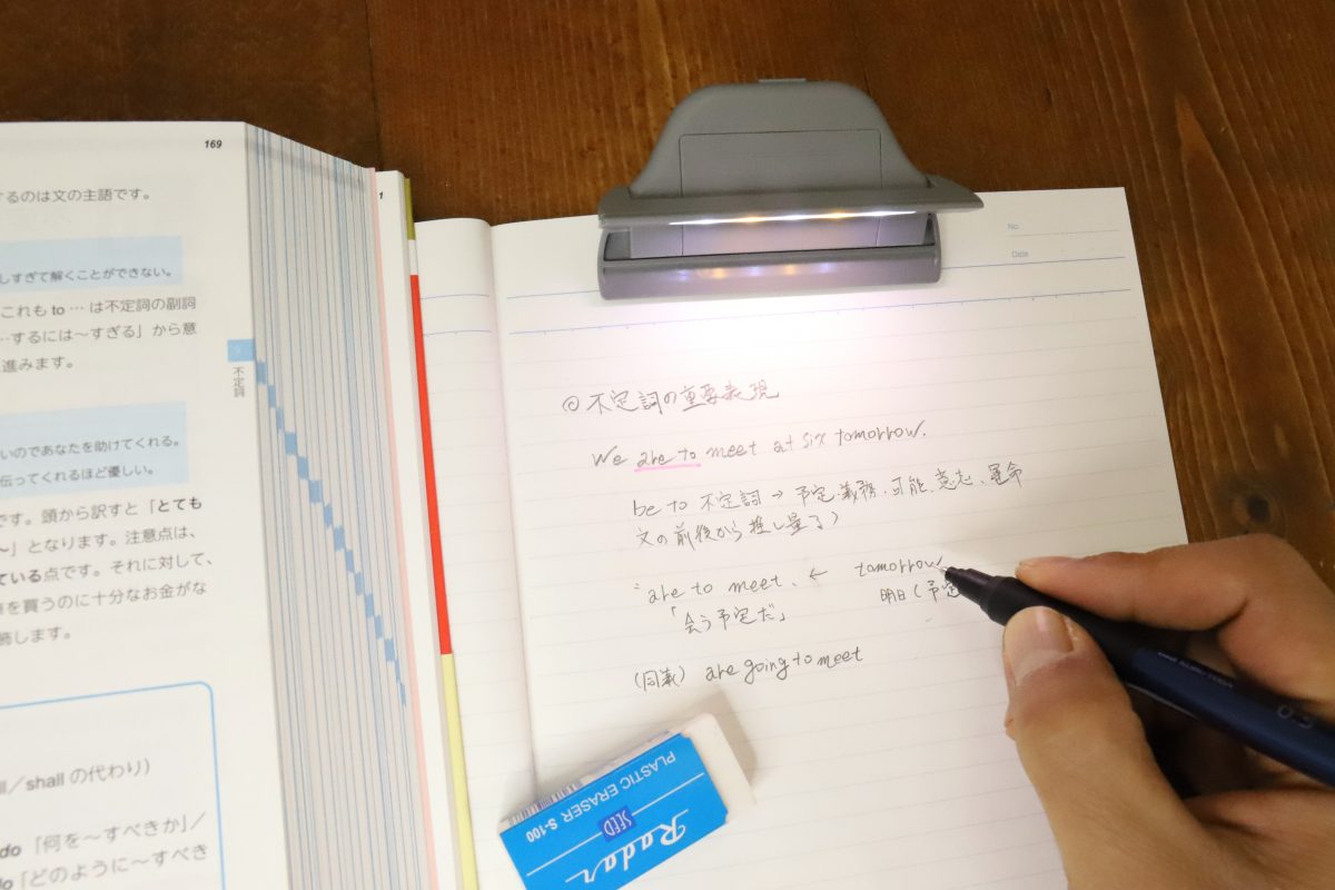 書き物ライトとして使うなら、勉強中のノートに装着するのも良さそうだ。明るい室内であっても、ノートに覆いかぶさるような姿勢で書いていると手元が影になりやすく、その結果、目が疲れて集中力が低下することもある。このライトは手元の低い位置から照らしてくれるため影ができにくく、目を守るライトとしても優秀だ。
