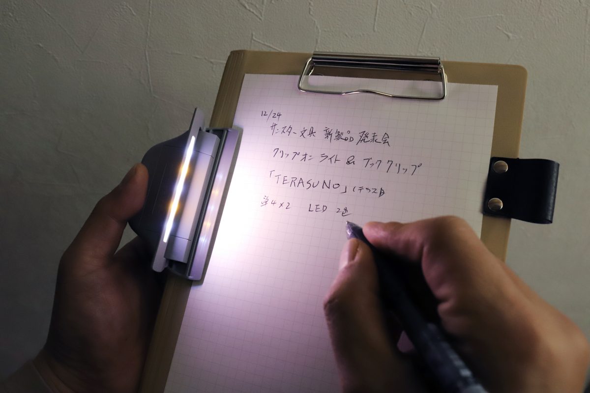とくに筆者が気に入ったのは、クリップボードへの装着である。手元だけを明るく照らしてくれるため、製品発表会のスライドショーのように室内の灯りを落とした環境でもしっかりとメモを取ることができた。周囲に迷惑をかけるほどの光量ではない点もありがたい。
