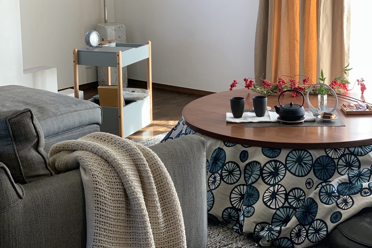 ソファのカバーリングだったらいろんな商品を見て色や素材を検討するのに、こたつカバーの場合は使う季節が限定されるからなのか、“このくらいでいいや”という意識になりがち。こたつをおしゃれに導入したいなら、空間全体を引きで見る視点が大切になってくると思います」
