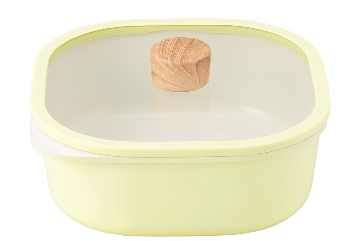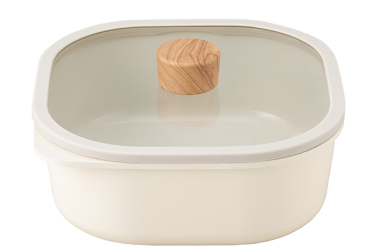 グローバルに展開する人気キッチンメーカー「NEOFLAM」との共同開発によるカセットこんろ用のお鍋です。鍋の内側と外側に計4層のセラミック加工を施したアルミ鍋で、カセットこんろ以外にも、ガステーブルやIH調理器、オーブン等でも使用可能です。丸みのある20cmのスクエアデザインで、木目調のノブが可愛いガラス蓋付き。煮込み料理や蒸し料理、オーブン料理、炊飯など毎日の料理を幅広くサポートします。