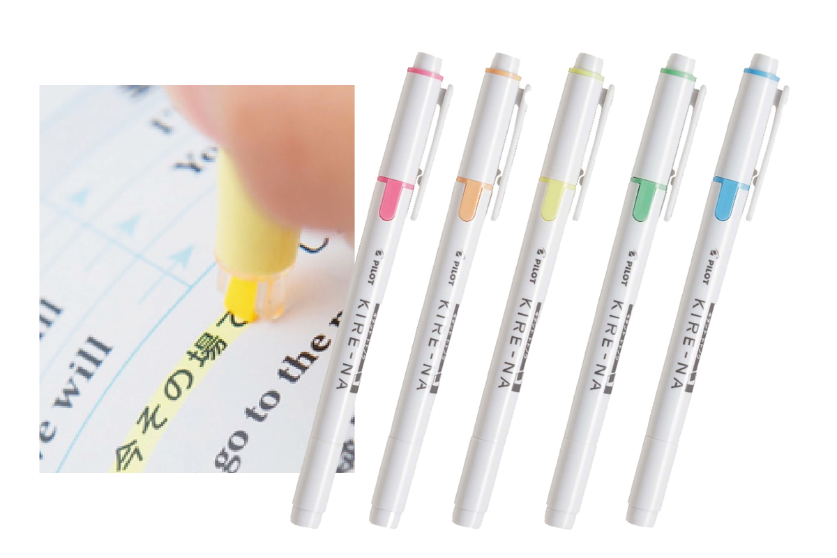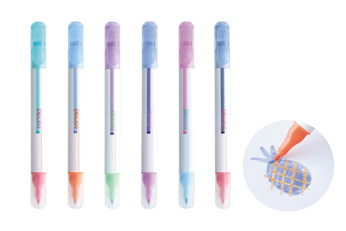 インク色が異なるマーカーペンと細字ペンのツインタイプ。マーカーペンで書いた線の上に細ペンで文字を重ねてもにじまない。加えて、薄い色と濃い色を重ねても、化学反応により薄い色がきれいに発色。