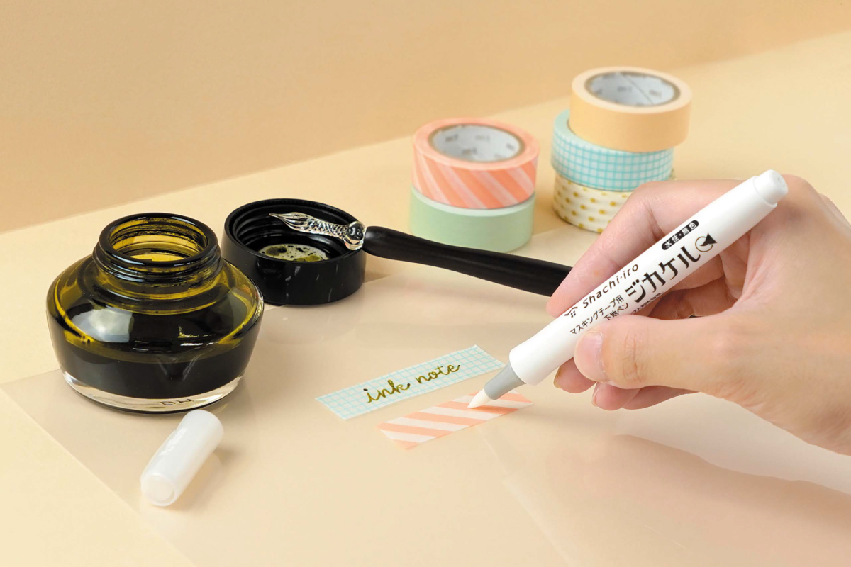 マスキングテープへの水性インクの書き込みを、弾かれないようにする下地ペン。書きたいところに塗布して、約30秒乾かすだけ。水性ペンはもちろん、万年筆を使ったマステのデコレーションも可能に。