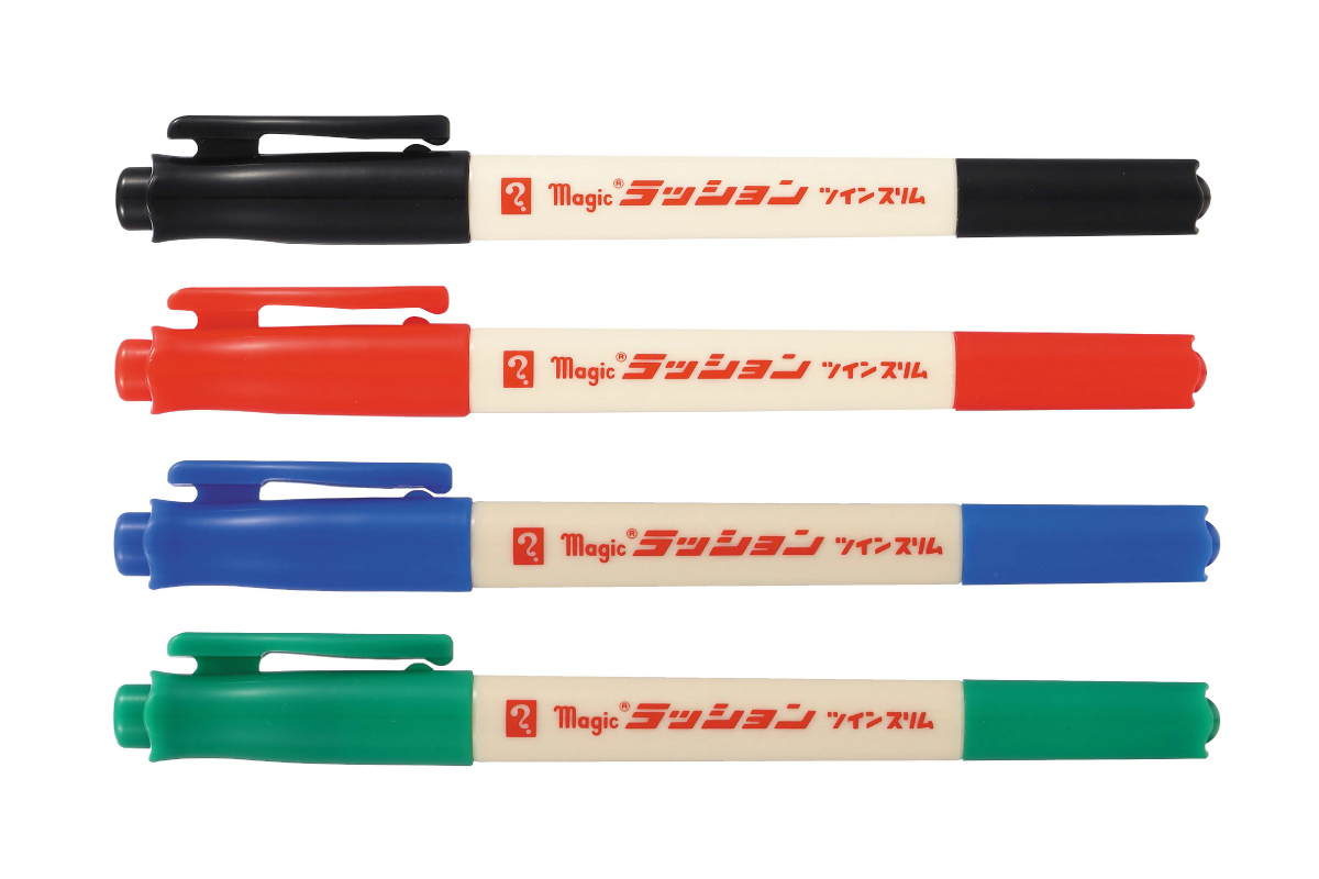 鮮やかな色合いと裏移りのしにくさで人気の水性ペン、「ラッションペン」のツインタイプ。細字と極細、ふたつの線幅で書け、宛名書きや事務用途はもちろん、POPやイラストを書くのにも活躍する。