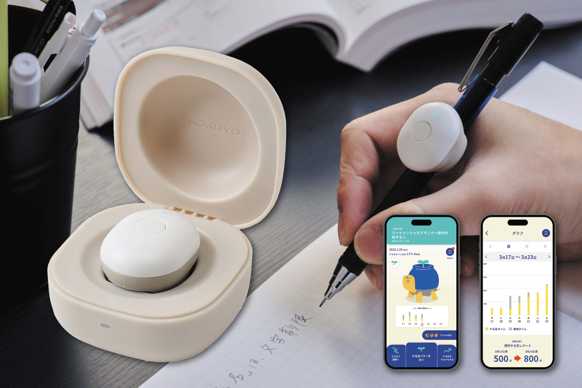 ペンやAppleペンシルなどに付けて使う、加速度センサーを搭載したIoT文房具。スマホアプリと連携させると勉強量が「やる気パワー」として記録され、努力を見える化できる。モチベーション維持に貢献。