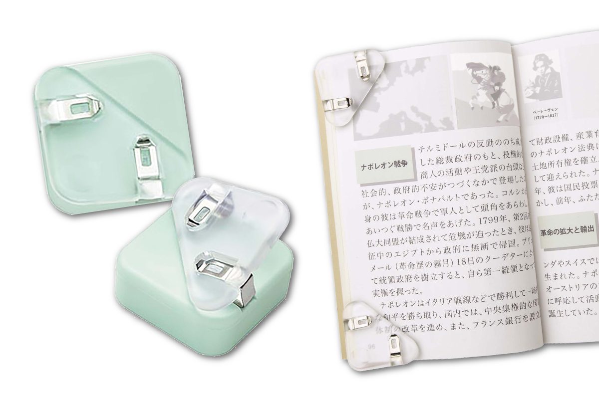本のカドに留めて、ページを開いたままキープするクリップ。透明のため、文字を隠さずに挟める。2個入りで、ページの上下を挟む以外に、内蔵した磁石で2個くっつけて重さをアップさせることも可能だ。
