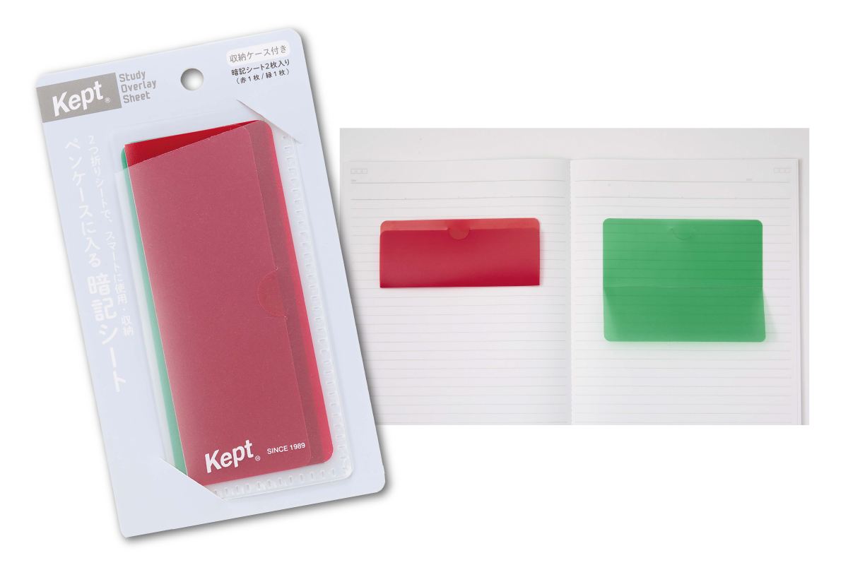 シーンによって使い分けができる、二つ折りの暗記用シート。赤シート、緑シート、専用ケースがセットになっており、折った状態ならペンケースにも入れられる。ラインマーカー付きのセット(935円)もある。