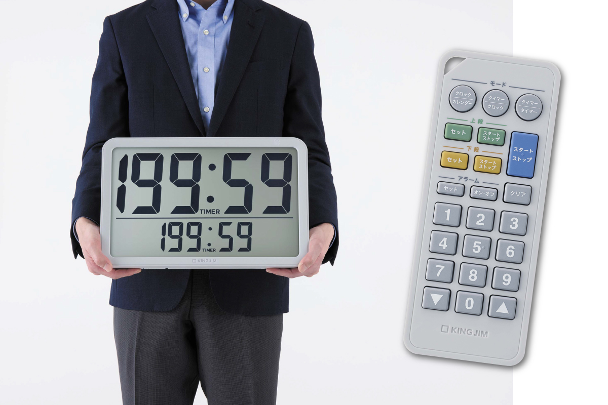 教室や工場など、広い場所で見やすい大型画面のタイマー兼電波時計。時刻と日付、時刻とタイマーなど、2つの機能を同時表示できる。リモコンで操作でき、壁掛け、磁石、据え置き、3通りの設置に対応。