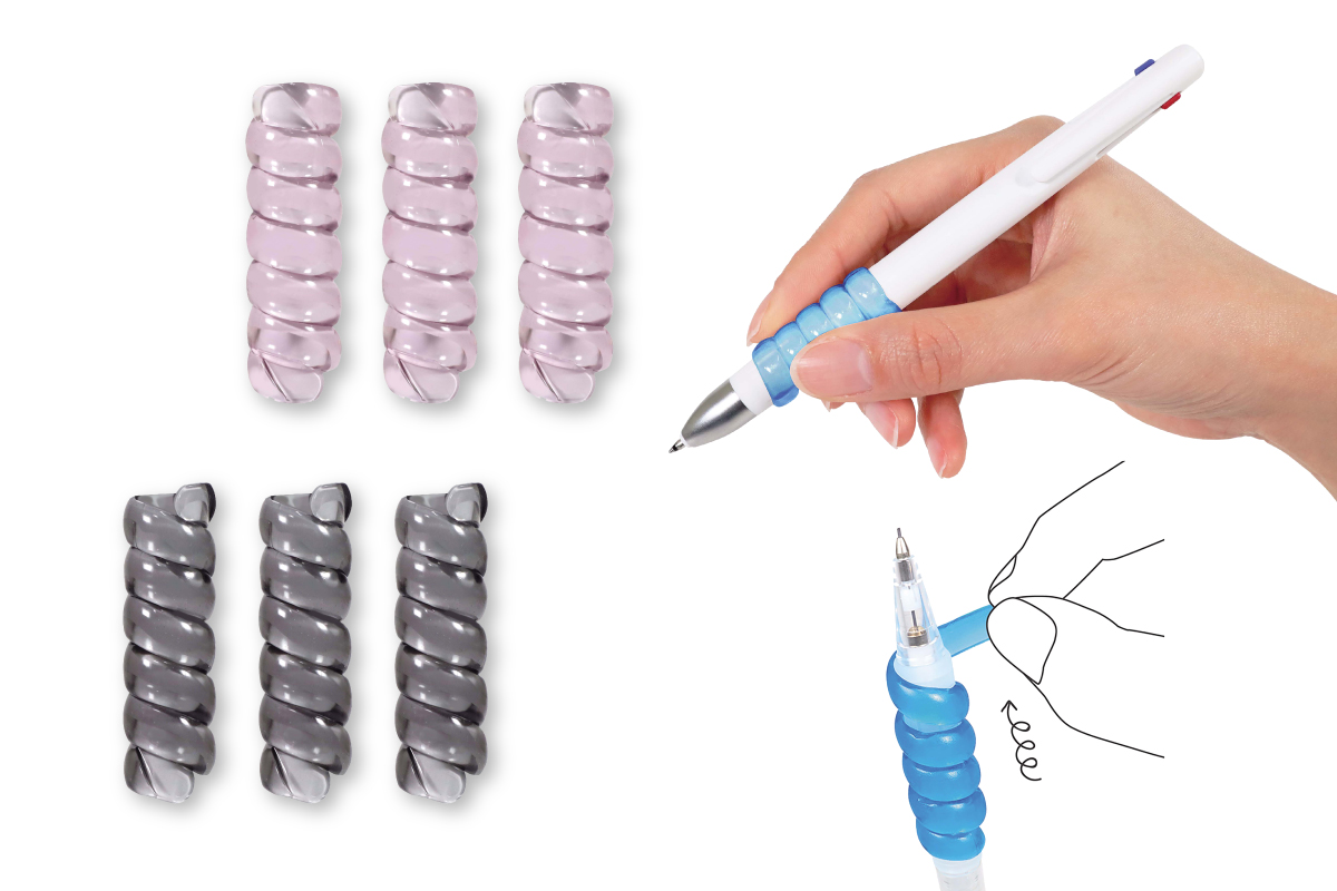 直径約8㎜から14㎜まで、筆記具の太さに関係なくくるくる巻いて装着できるペンシルグリップ。やわらかなエストラマー素材で指当たりがやさしく、スパイラル形状が指にフィット。長時間使っても疲れにくい。