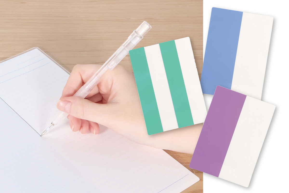 定規を使わずにノートに分割線を引ける段差ガイド付きの下敷き。段差の左右で色が異なり、紙の上からでも境界線が透けて目印に。2分割用と4分割用があり、どちらもウラはフラットで下敷きとして使える。