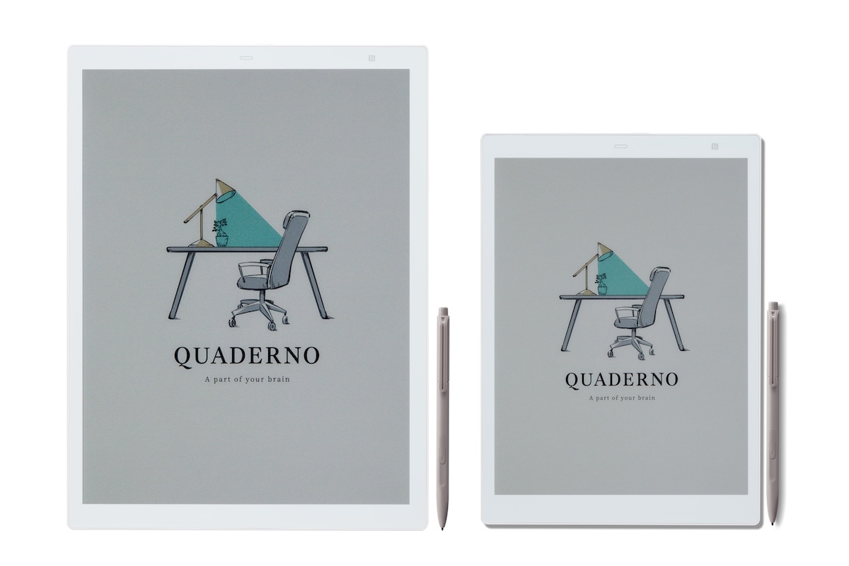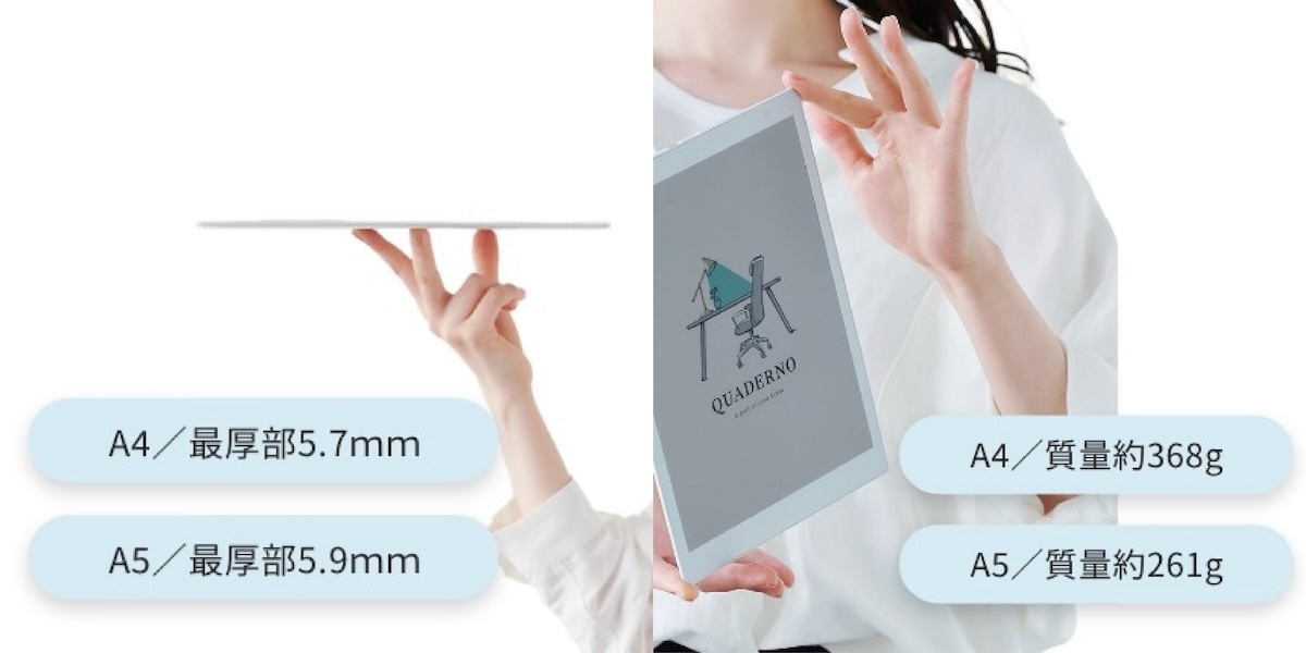 QUADERNO(Gen.3C)←製品詳細はこちら本物の紙とペンのような書き心地で人気の電子ペーパーの最新モデル。前モデルは画面がモノクロ表示だったが、本モデルからカラー表示が可能になった。A4とA5の2サイズ展開。