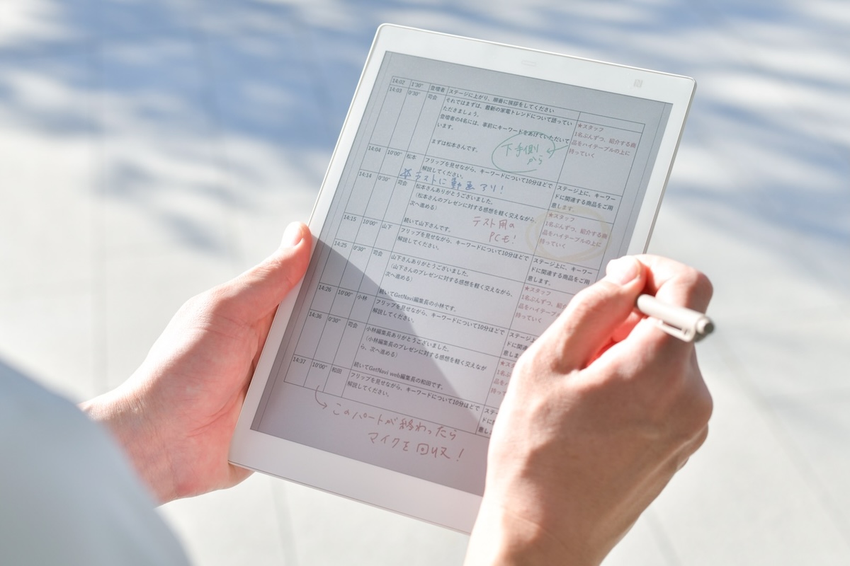 一般的なタブレットは画面が反射して見にくくなりますが、QUADERNOの画面は太陽の下でもコントラストが効いているので見やすかったです。イベント中ってけっこうバタバタしているんですが、カラー画面なら急遽変更になったことなどを目立つ色で書き込めるので、慌ただしいなかでも見逃しが防げると思いました。