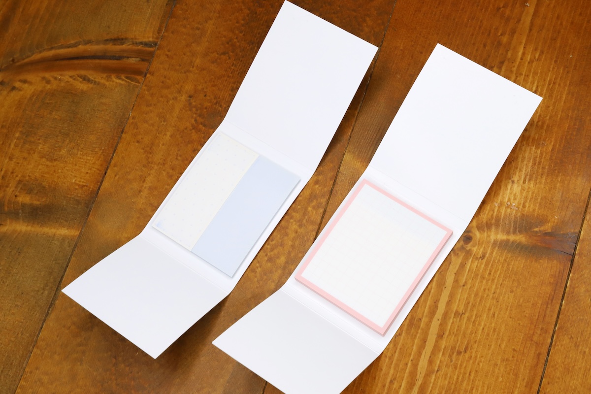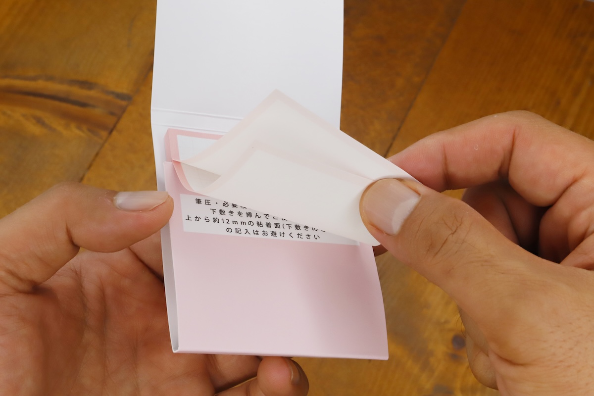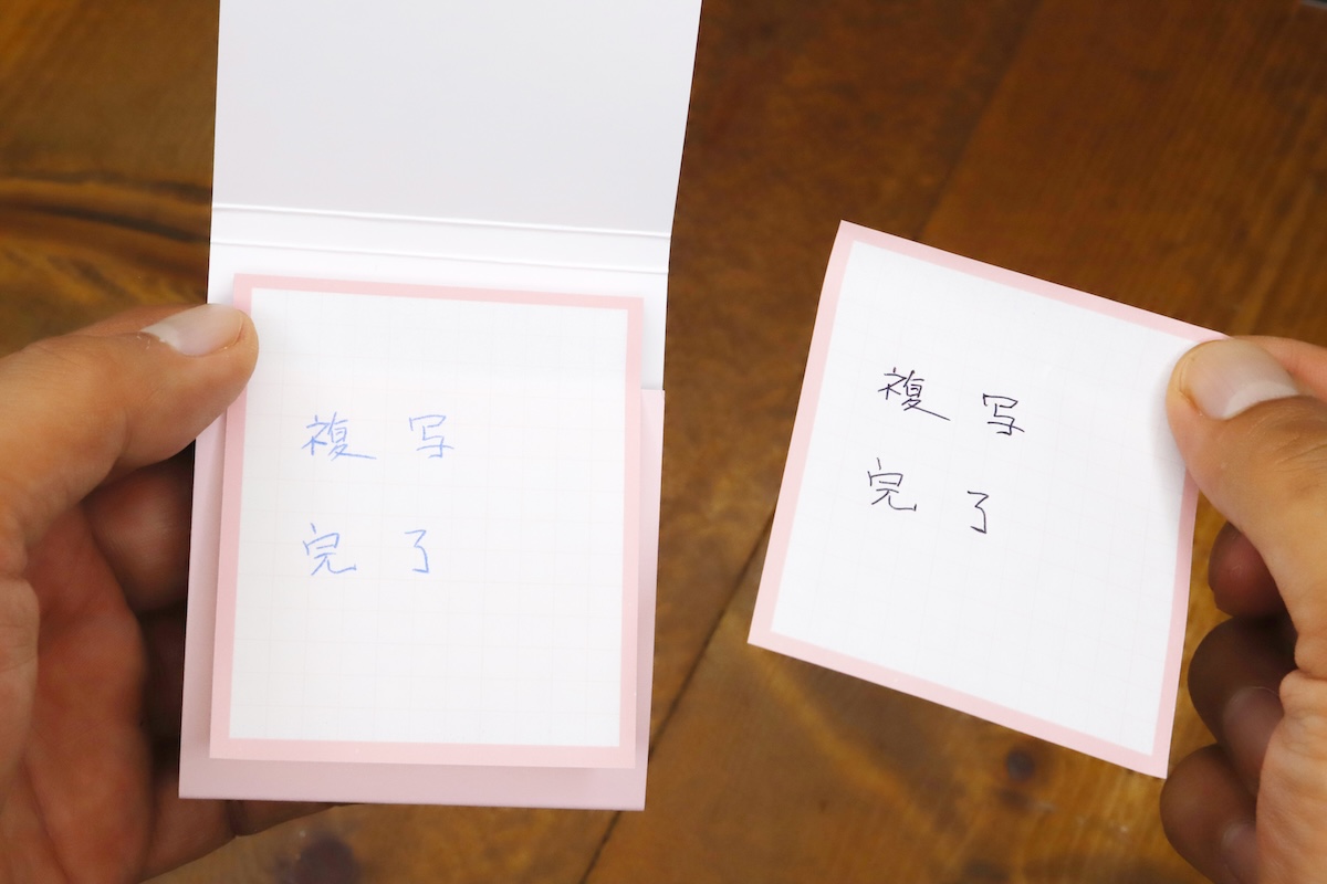 これはノンカーボン複写用紙を付箋化した製品で、使い方はシンプル。まず複写したい枚数分だけ紙をめくり、下敷きにもなるカバーを差し込む。あとは一番上の付箋に筆圧をかけて書くだけで、同じ内容が下の付箋にも転写されるという仕組みである。