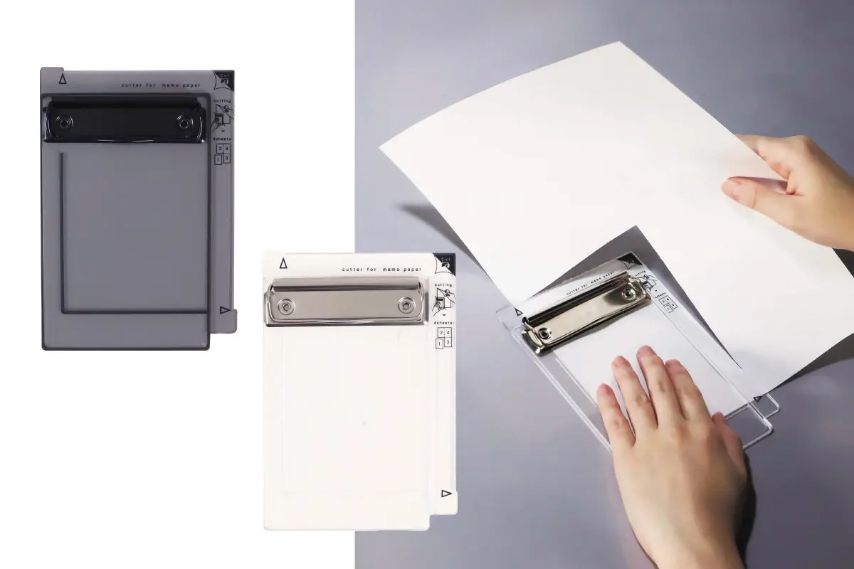 A4の紙を簡単に4分割できるペーパーカッター。紙の上に置いて、紙を手前にめくるようにして、上辺と右辺をカットする。カットした紙を付属のクリップに挟めば、メモパッドが完成。裏紙の再利用に最適だ。