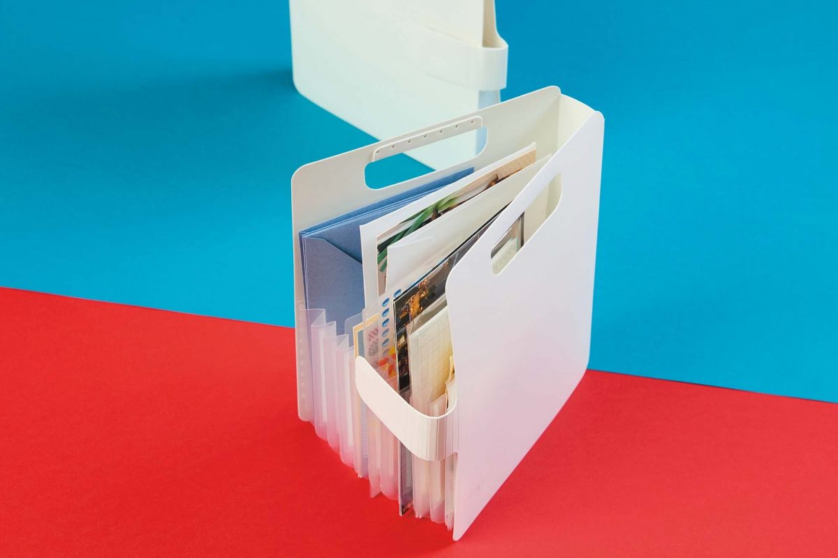 冷蔵庫に貼り付けられるマグネット付きファイルシリーズの郵便物整理に特化したタイプ。投函予定の郵便物やメモを挟めるフラップと、インデックスが付いた階段式のポケットが付いている。白と黒の2色展開。