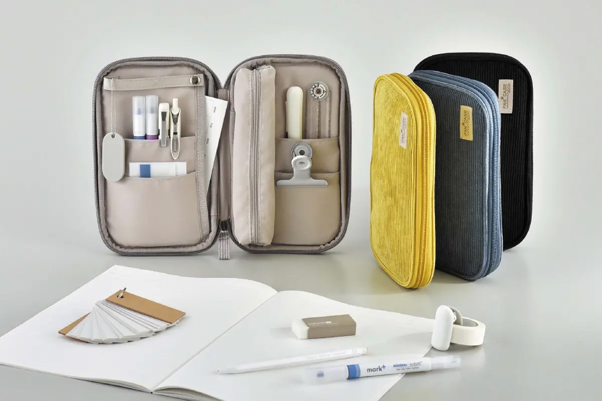 ノートのようにパッと開いて中身を一覧できる、薄型のブックタイプペンケース。6つのポケットとストラップホルダーを備え、きれいに仕分けしながら収納できる。表面は触り心地の良いコーデュロイ素材。