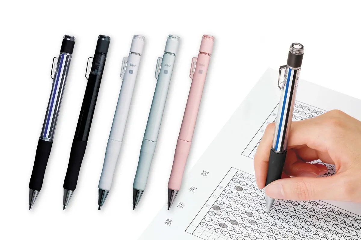 マークシートの記入に適した1.3㎜の太芯用シャープペン。200問解いた場合、芯径0.5㎜にくらべ2分40秒早く塗り潰せる。上部には、ピンポイントで消せる繰り出し式のモノ消しゴムを搭載。