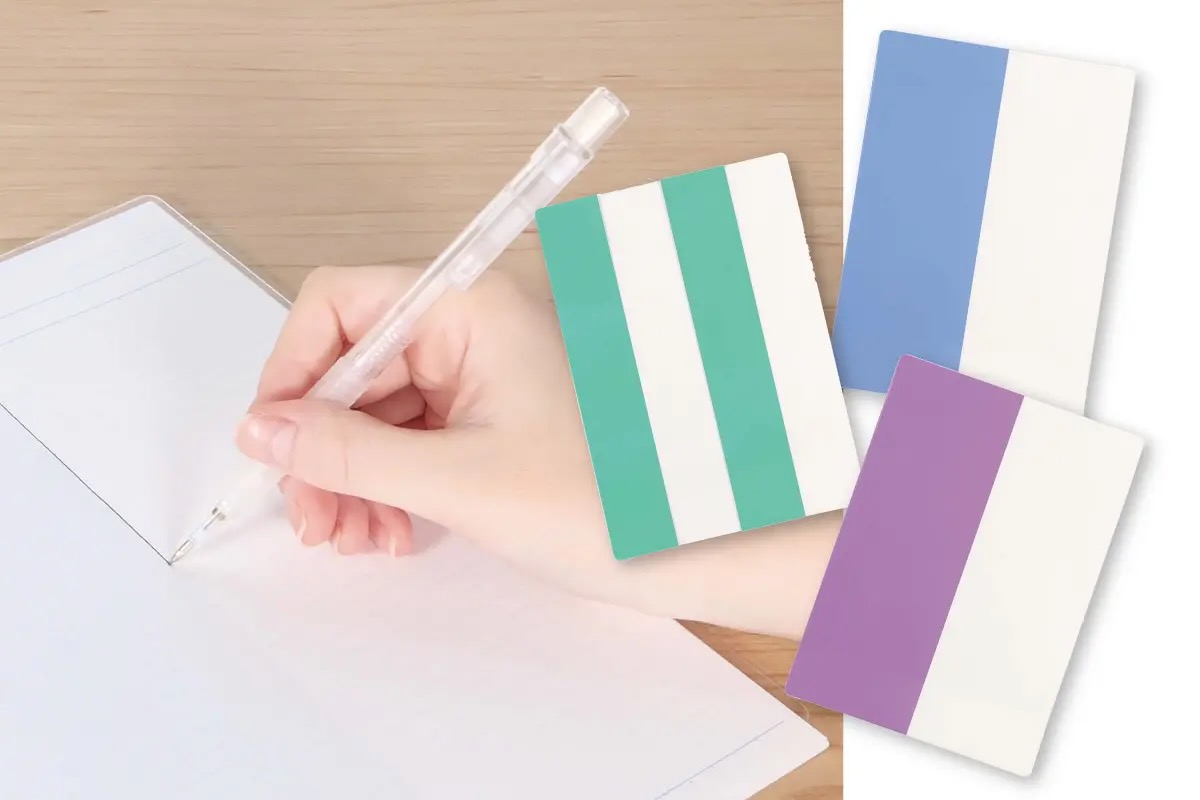 定規を使わずにノートに分割線を引ける段差ガイド付きの下敷き。段差の左右で色が異なり、紙の上からでも境界線が透け目印になる。2分割用と4分割用があり、どちらもウラはフラットで下敷きとして使える。