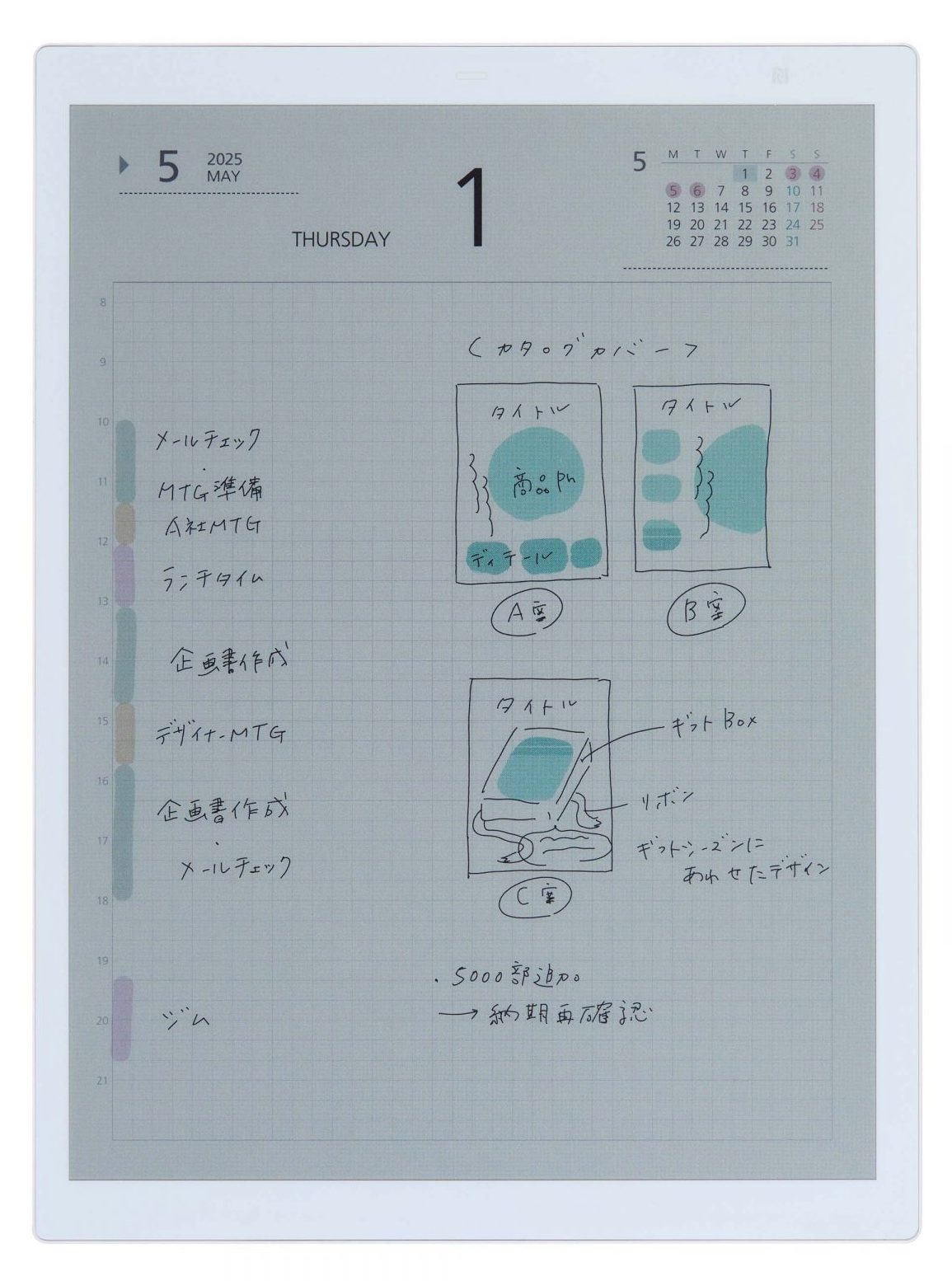 従来機もカラーで書き込めたが、端末での表示はモノクロだった(PCなどにファイルを取り出すとカラーに)。それに対し本機は、カラーで表示されて情報が見やすい。そして何より画面が華やかで、気分が上がる!