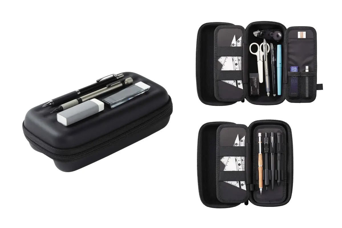 衝撃に強いEVA素材を使用。ペンホルダーのクッションループが、隣り合うペンがぶつかって傷つくのを防ぐ。フタはペントレーにもなる。