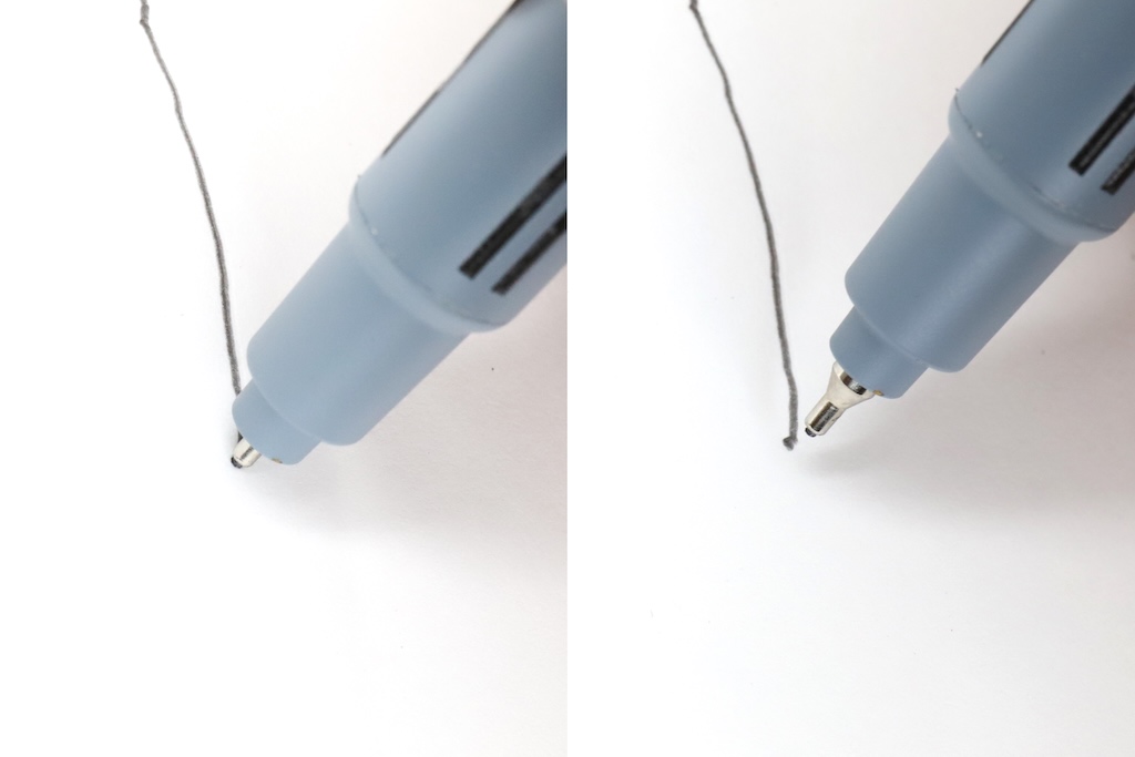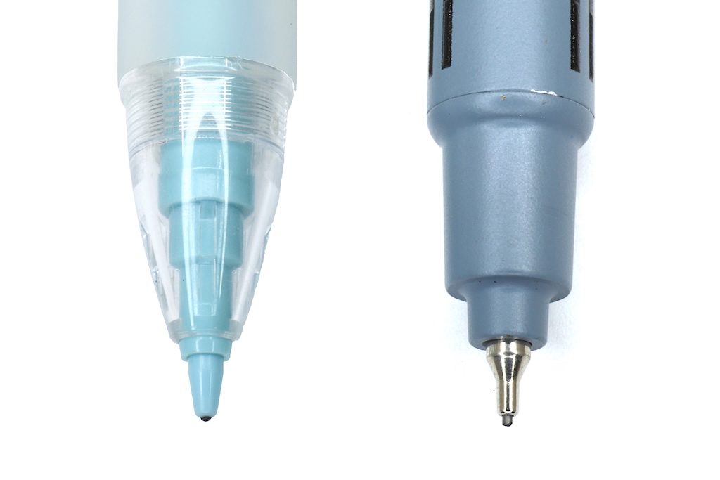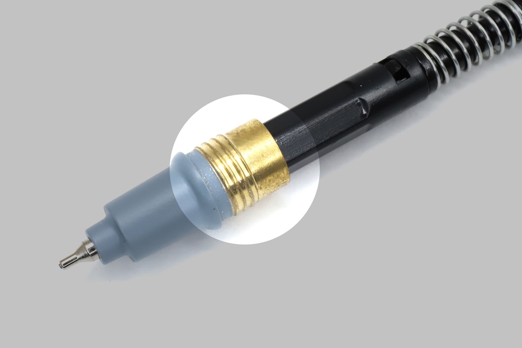 例えば、自動芯出し機構の要であるペン先部分は、プラスチックのコーン(円錐)からメタルのパイプに変更。パイプはさほど長くはないが、それでもコーンよりはずっと先端の視界が広く、細かな字が書きやすくなった。