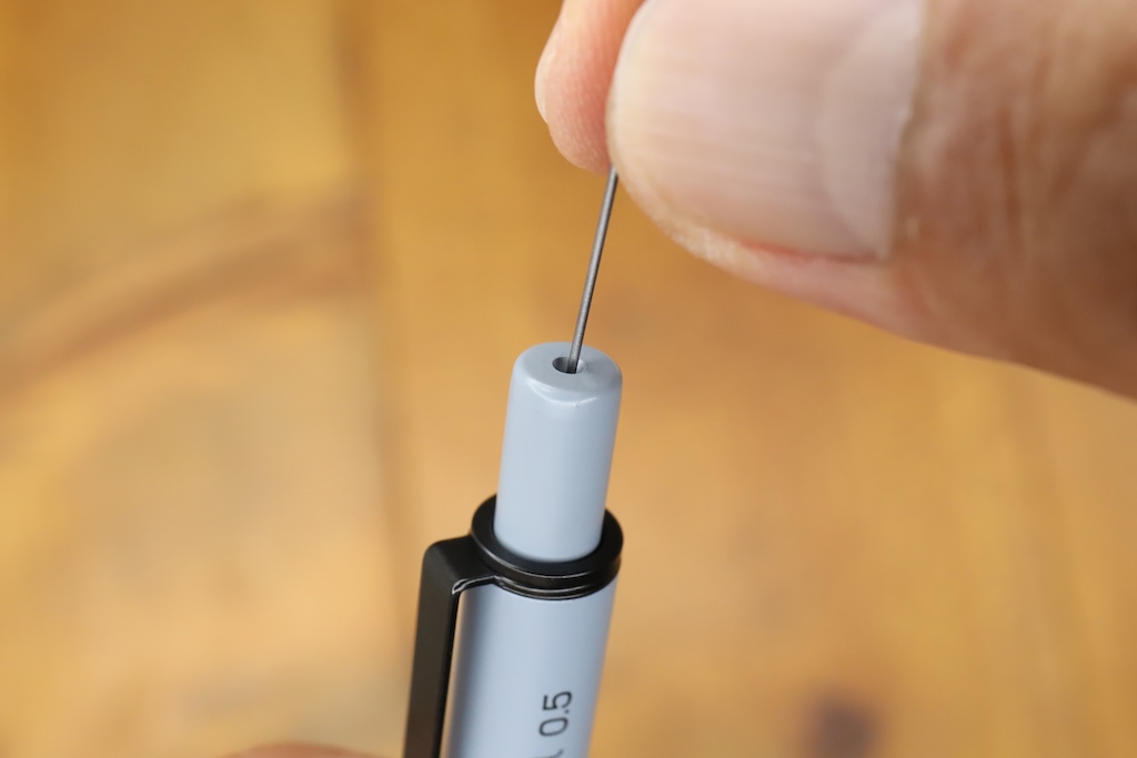 芯を入れたいときはノックの中央に空いている穴にそのままスルッと入れるだけ。内部の形状が工夫されているため、軸を逆さにしても芯が逆流することはまずない。
