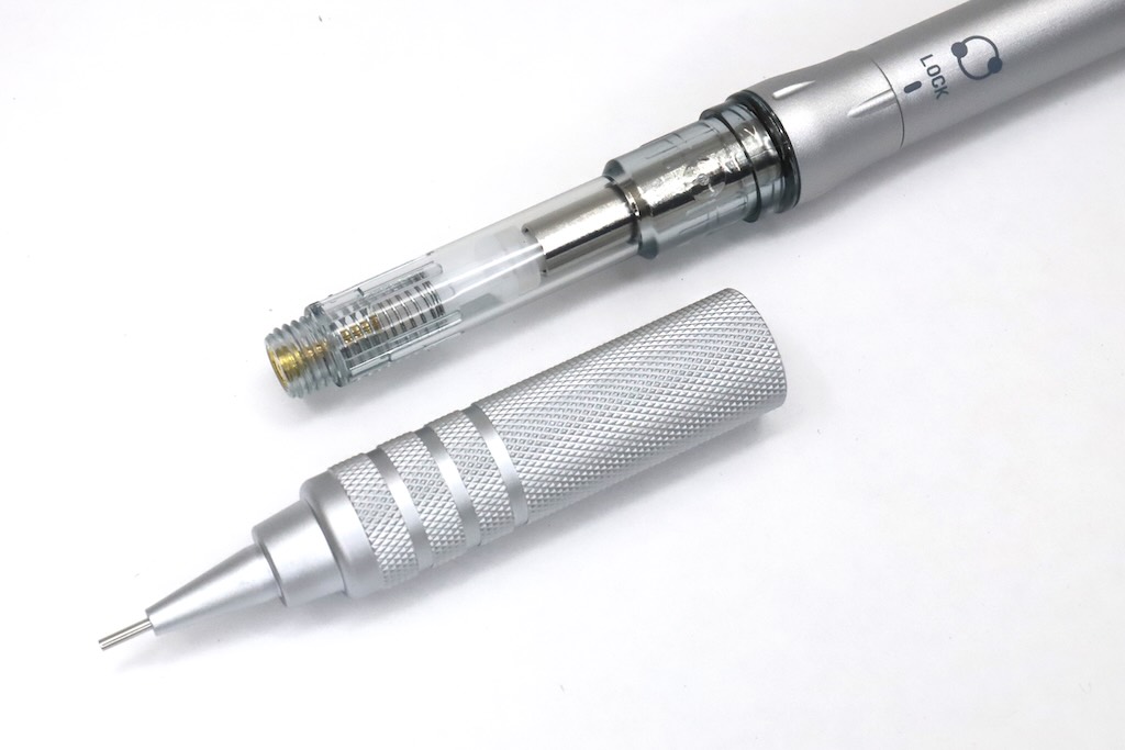 もうひとつの大きな変更点は、先端の口金をローレットグリップと一体化したこと。製図用シャーペンとしてはわりとよくある仕様だが、口金が緩んでガタつく心配がないことで、安定した筆記ができるというわけだ。