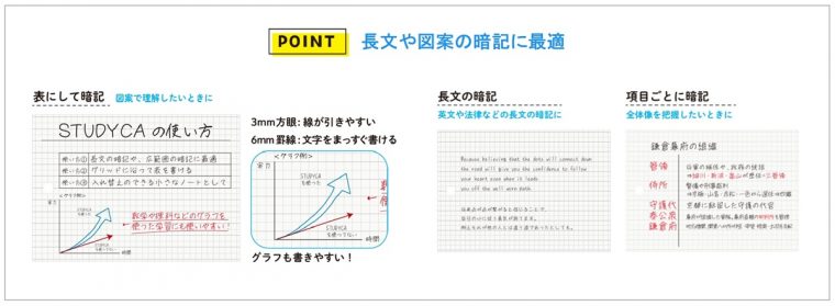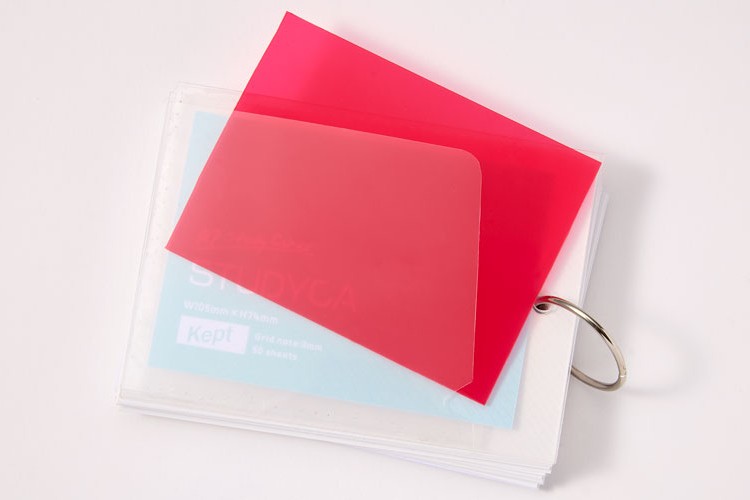 長文や図案の暗記に最適な、少し大きめサイズの単語帳。方眼グリッド入りなのでグラフなども書きやすくなっています。暗記用の赤シートと収納ポケット付き。表紙を入れ替えることが可能です。
