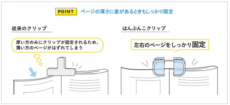 はんぶんこにしても、連結しても使えるクリップ。左右のページの厚みに差があっても、ページをしっかり固定できます。文字を隠さず読めるクリア素材を採用。メモスタンドとしても使えます。