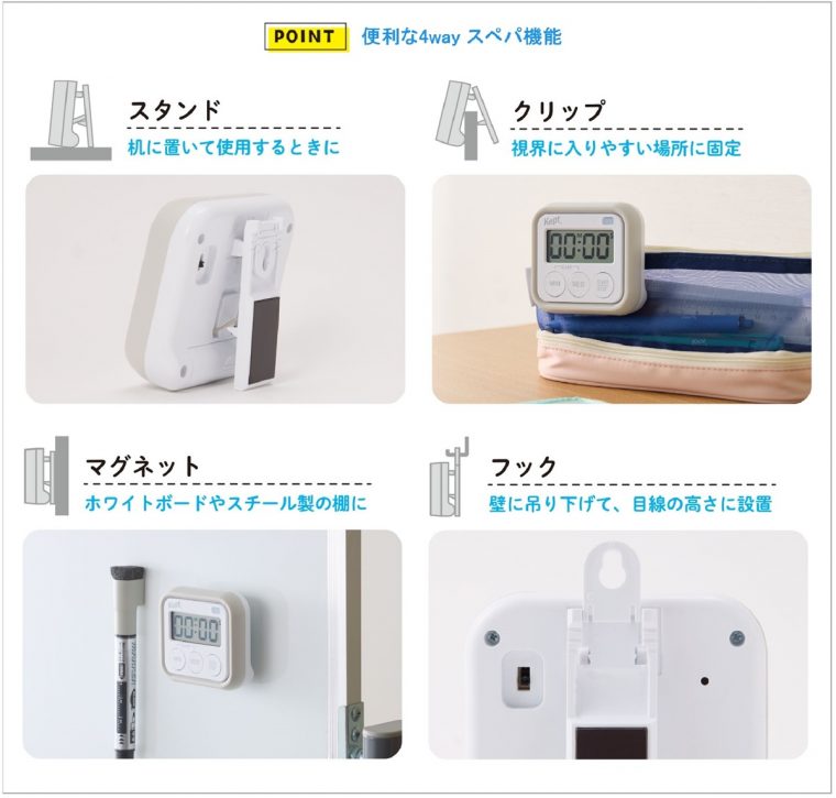 机に置いて、クリップで固定して、マグネットで貼り付けて、フックで吊り下げて、と好きな方法で設置できる4way対応の学習用タイマー。音で知らせるほか、光で知らせるサイレントアラームモードに切替可能。電源は単4形乾電池×1本で、軽量&コンパクトサイズです。