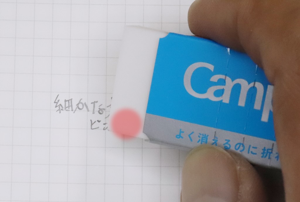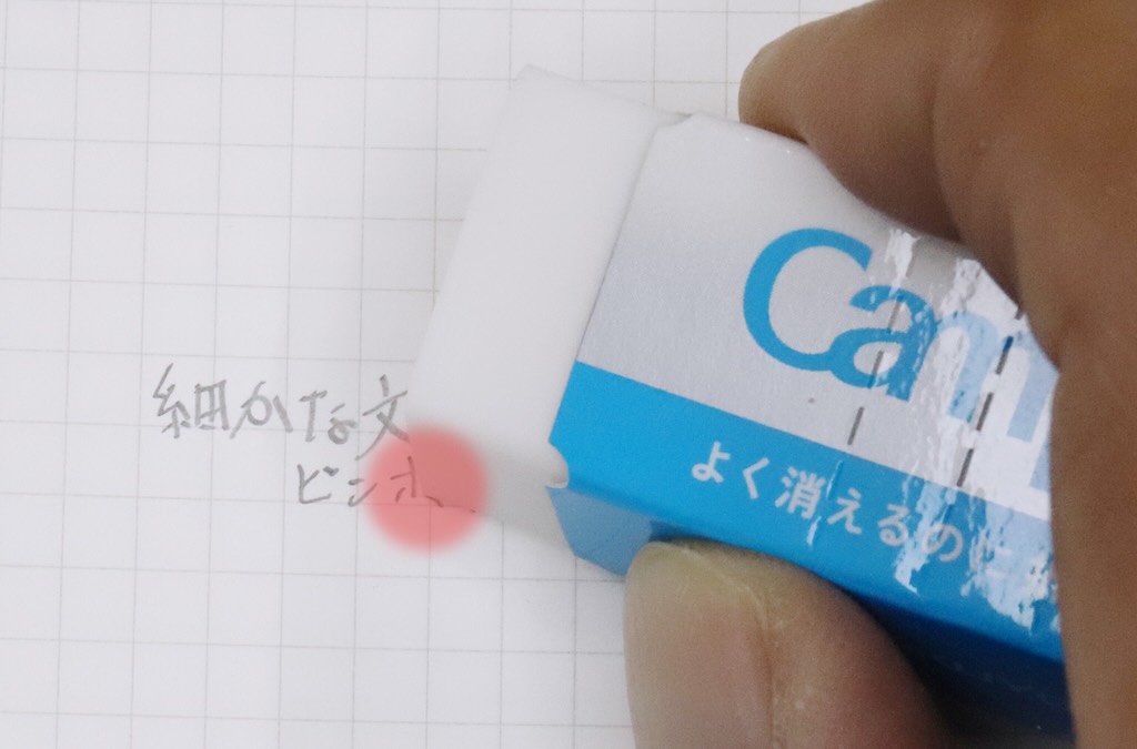 小さなカドで消す前提の消しゴムなので、消し味はかなりカチッと硬め。