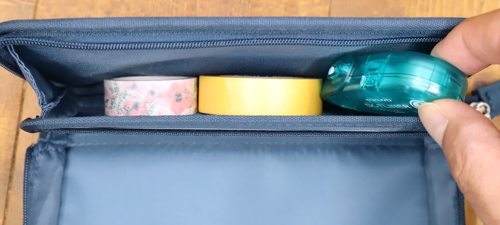 筆記具収納のペントレー部は、だいたいペン5〜6本+消しゴムが入ってちょうど、といったサイズ感だ。
