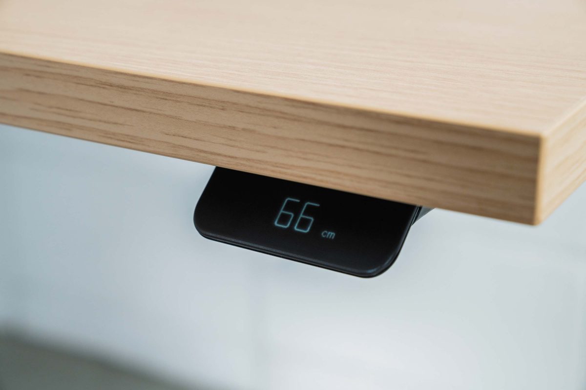 天板は高級家具に用いられる無垢材で、家具としてもハイクラスな佇まい。ウレタン塗装加工により、汚れや飲みこぼしも拭き取りやすい。コップを置いたままスムーズに昇降できる抜群の安定性と、静かな動作音も魅力だ。