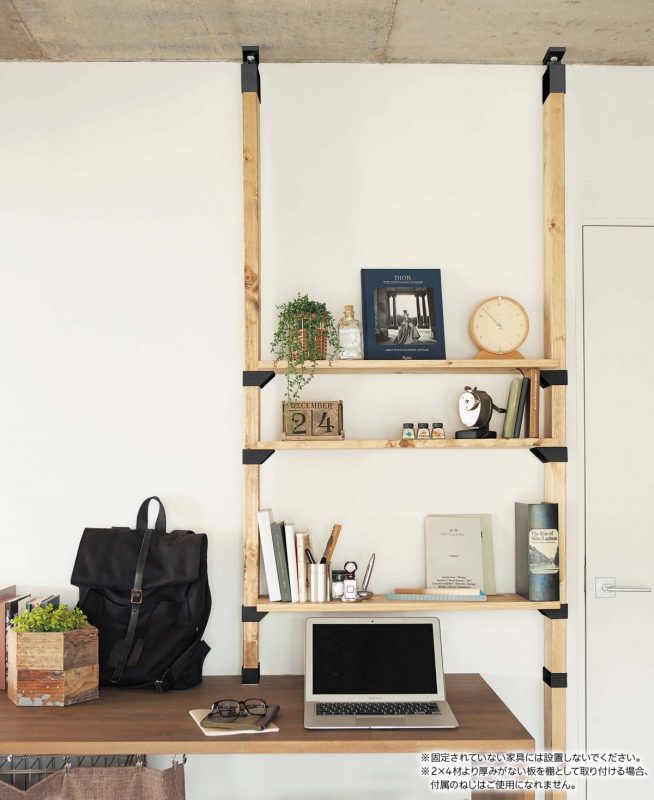 2×4など自分で用意した木材を天井と床に突っ張って固定する収納パーツシリーズ。英語の「研究室」(ラボ)と仏語の「寄せ集め自分で作る」(ブリコラージュ)が名前の由来で、アイデア次第で理想的な収納を作れる。木材に色を塗るなどアレンジもしやすい。
