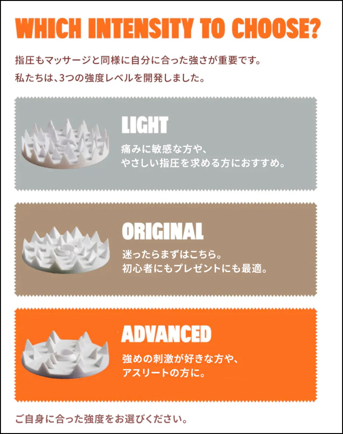 痛みが弱い順に、ライト、オリジナル、アドバンスド。トゲの数が多いほうが、圧力が分散するので痛みが軽減されるというワケですね。公式サイトにはオススメのレベルを教えてくれる、シャクティ診断なるものも用意されています。