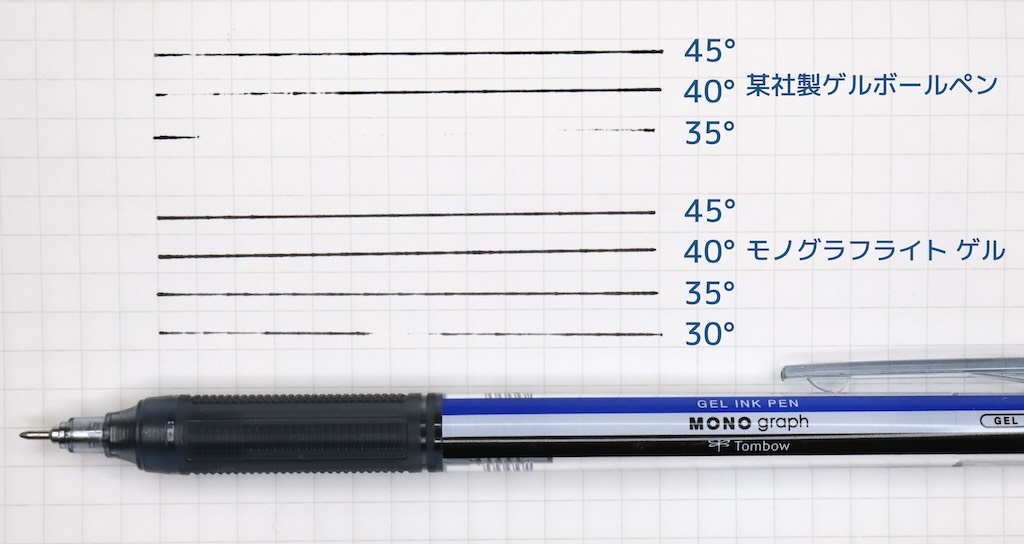 試してみると差は歴然で、他のゲルインクボールペンだとインクが出なくなるような筆記角度でも、モノグラフライトゲルは当たり前のようにサラーッと書ける。