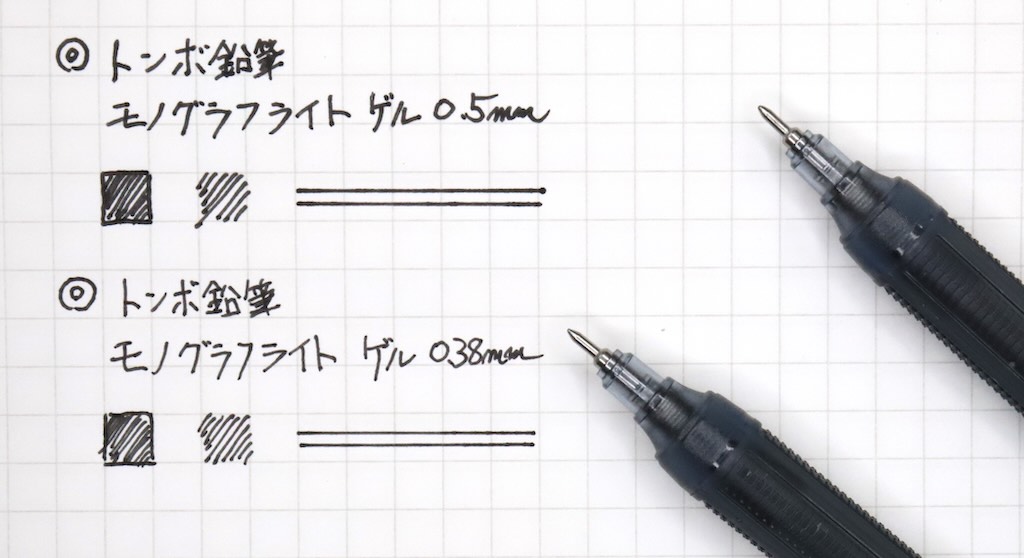 対して0.38mmはインク流量が抑えられている分、サラッとしつつも程良いカリッとした引っかかりが手応えに残る。ペンが走り過ぎず、しっかりとコントロールが効き、丁寧に文字を書くのに向いたタイプと言えるだろう。