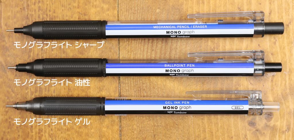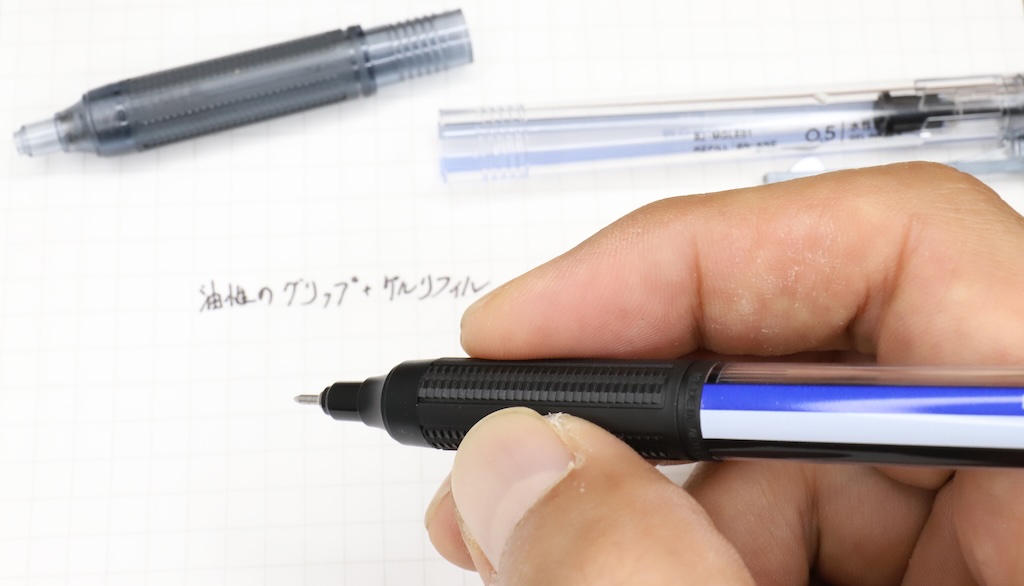 「油性よりゲルのほうが筆圧が少なく書けるから」など樹脂グリップ採用の理由はあろう。しかし冬でも手汗をかいてグリップが滑りがちな筆者は、従来モノグラフライトシリーズのゴムグリップが非常に気に入っていたため、この変更はかなり残念だ。