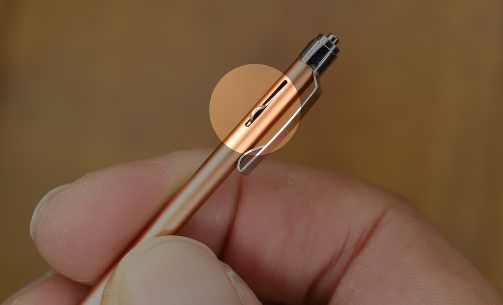 全長91mm、軸径約3.7mmは、一般的な綿棒よりちょっと長いかな?というぐらい。この細さにノック機構を搭載しているというのだから、本当に驚きだ。